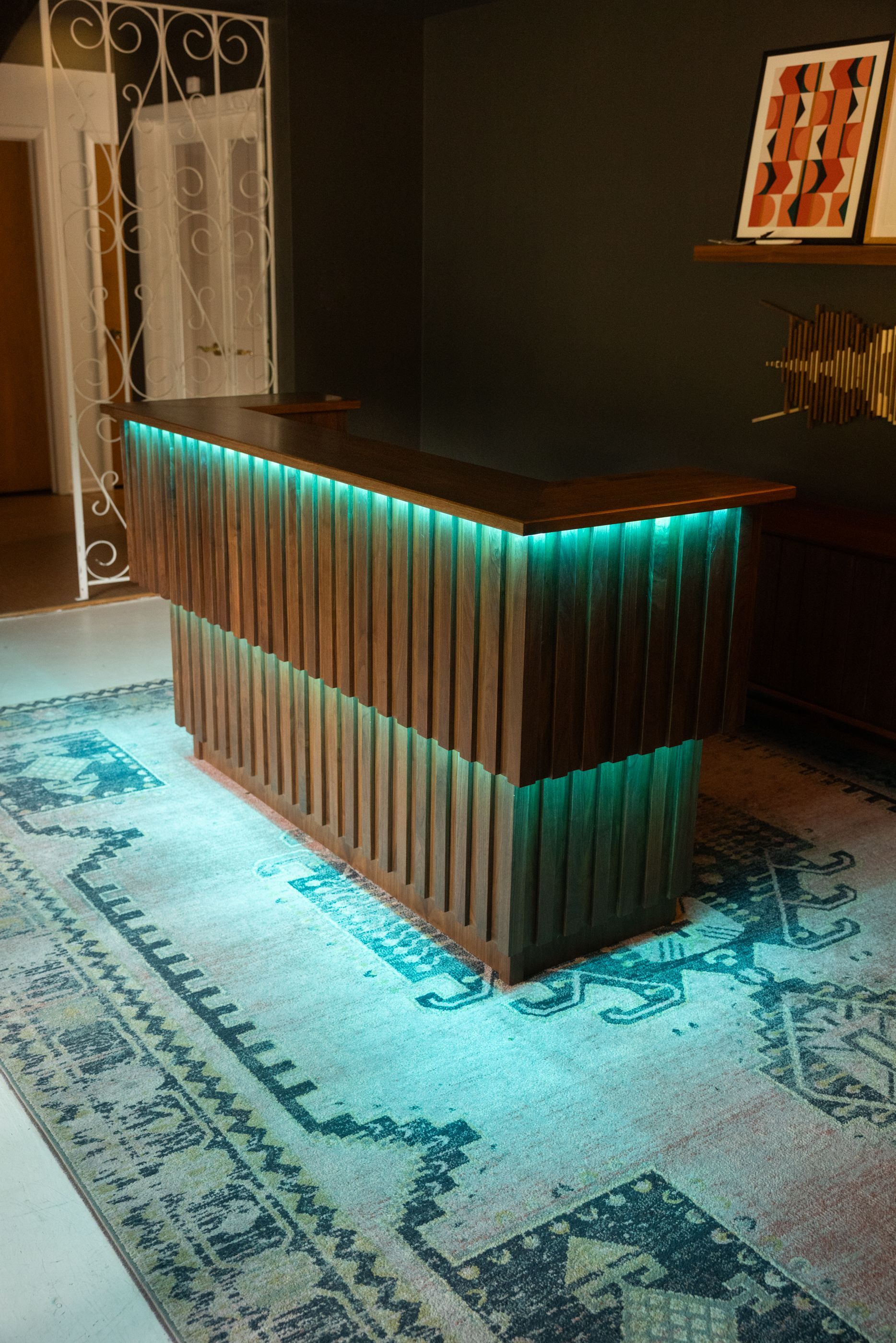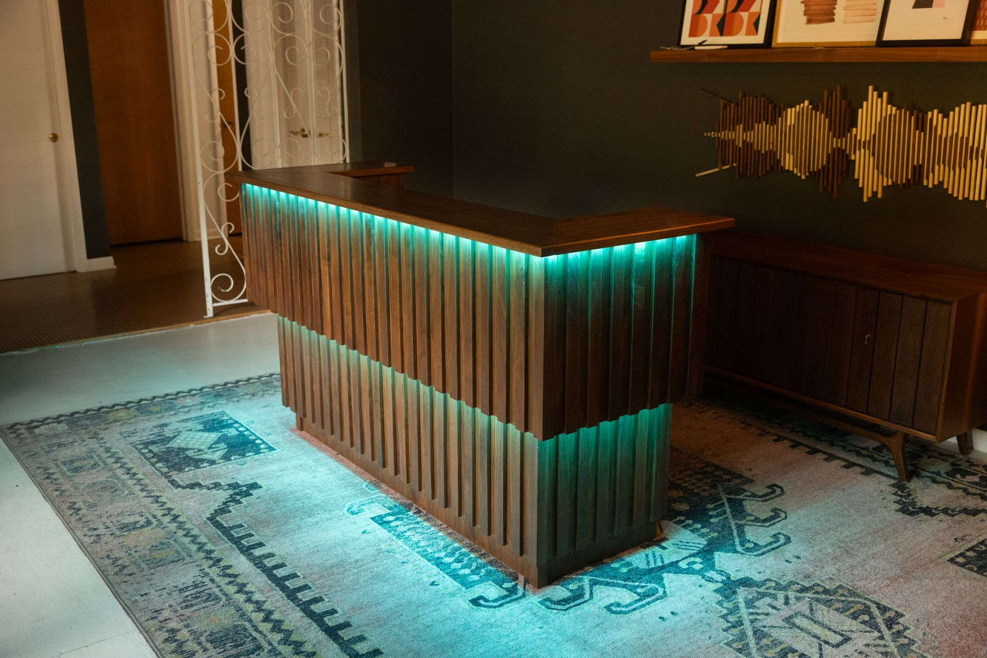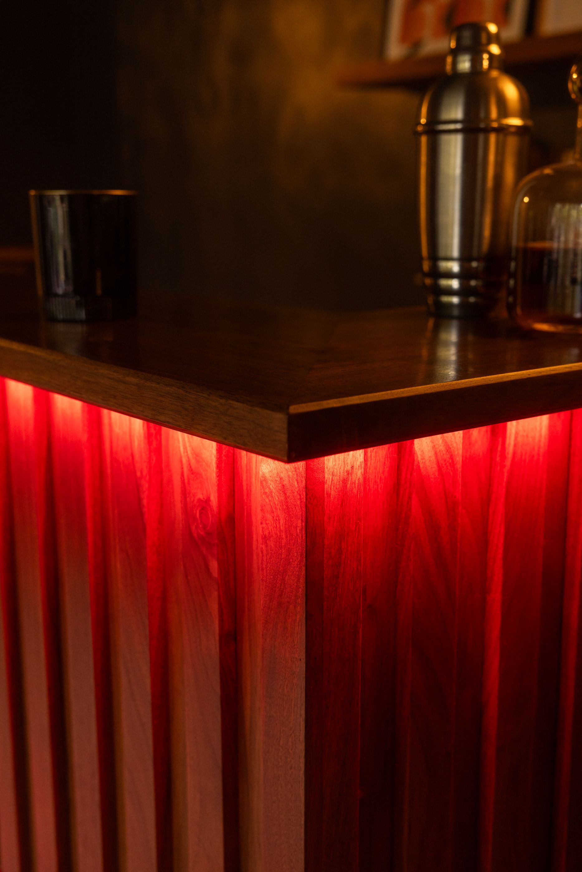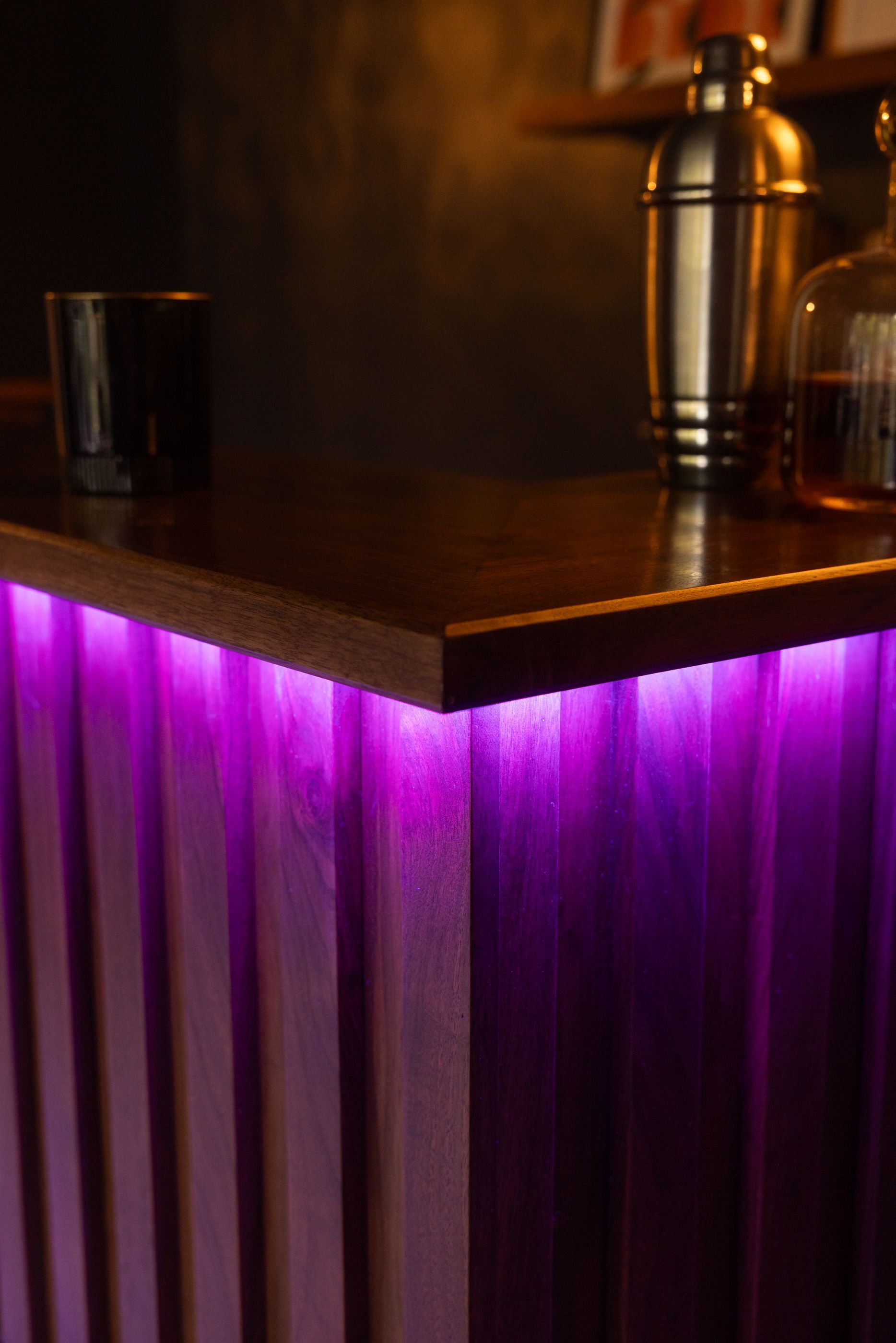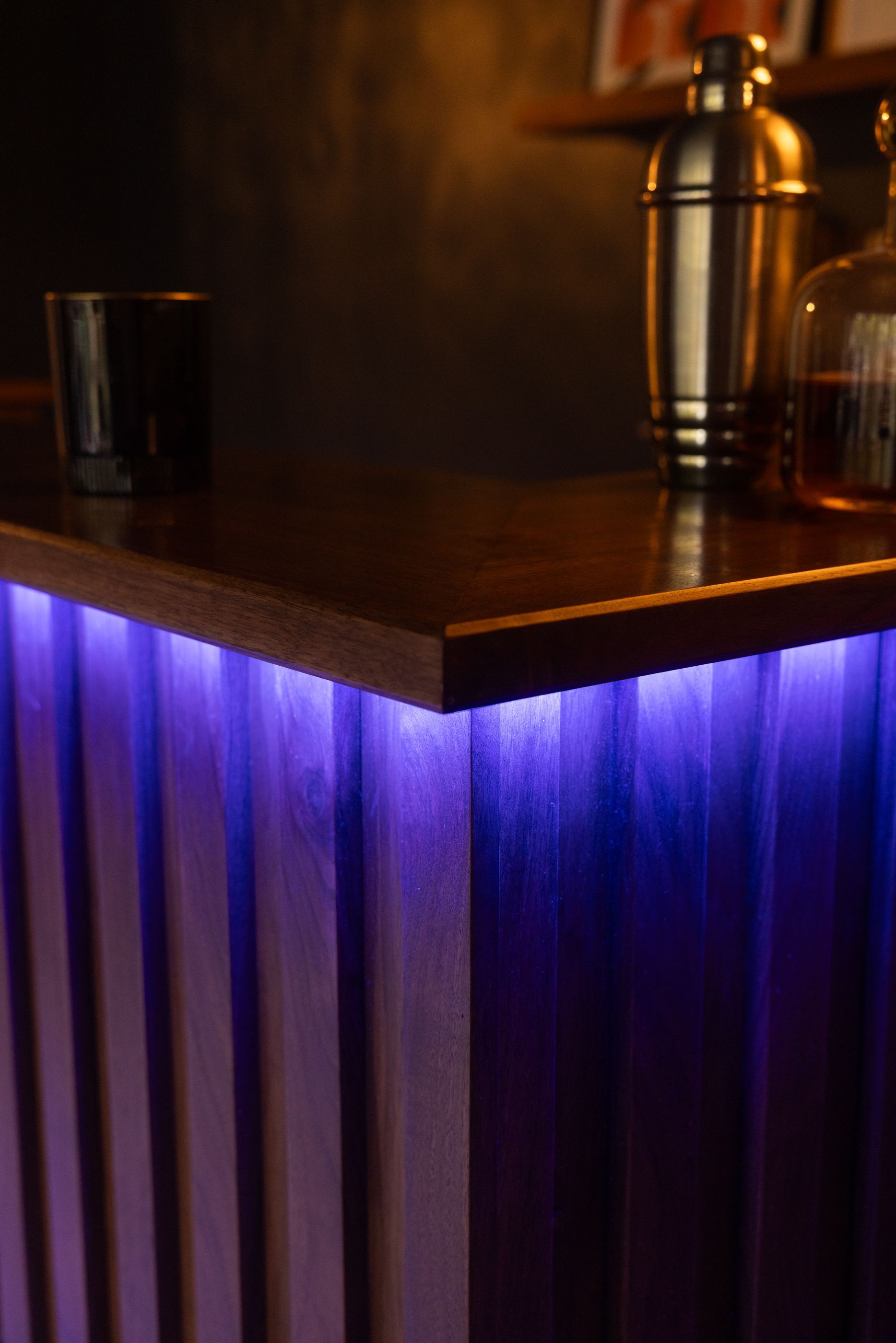 This is the first bar built under the Alessandrini Design label. It features a walnut tambour over walnut panels with our signature stacked array and lighting. The inside cabinets are black textured melamine to serve as a nondescript yet functional back bar. The counters are fabricated of solid walnut planks with a chamfered edge.