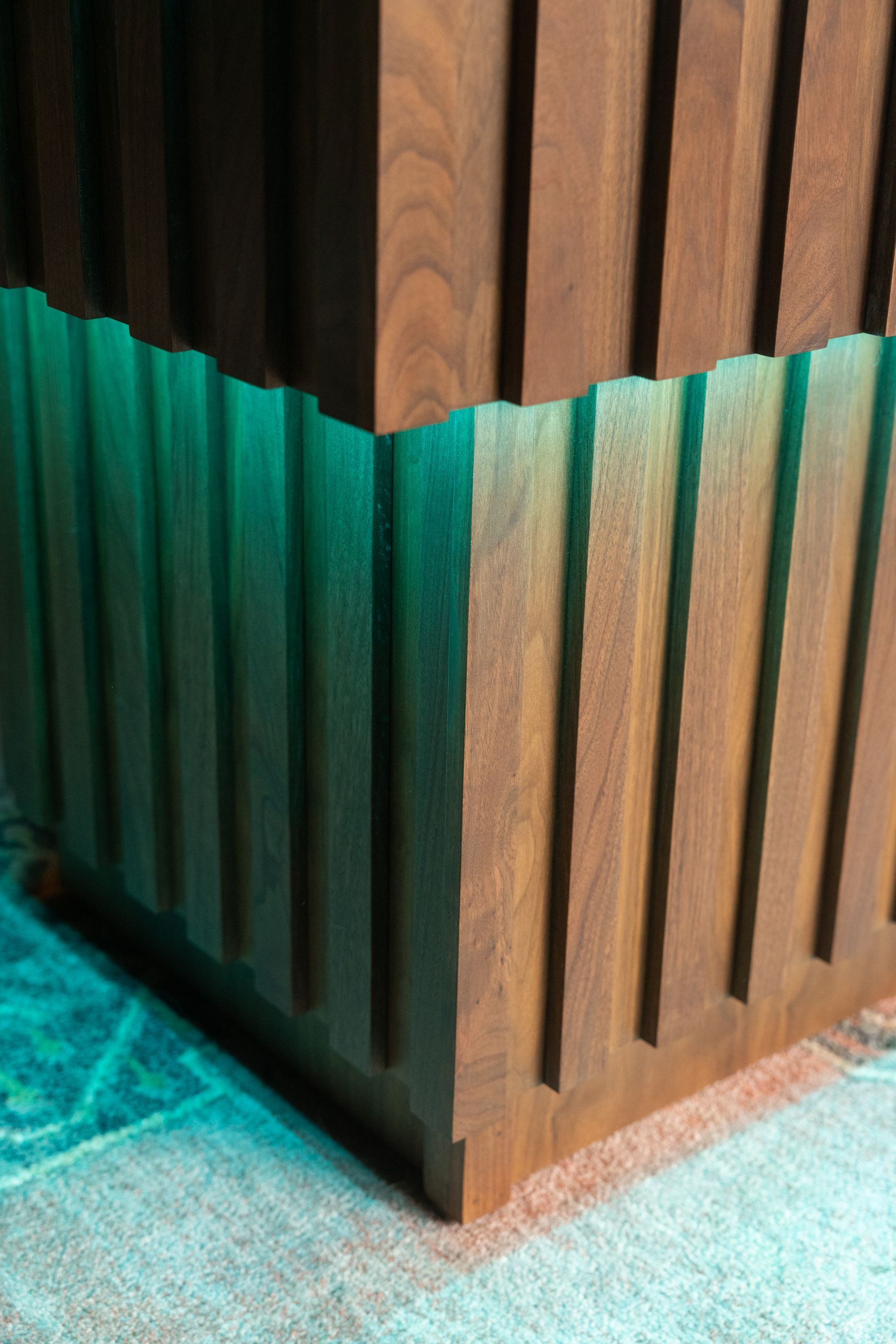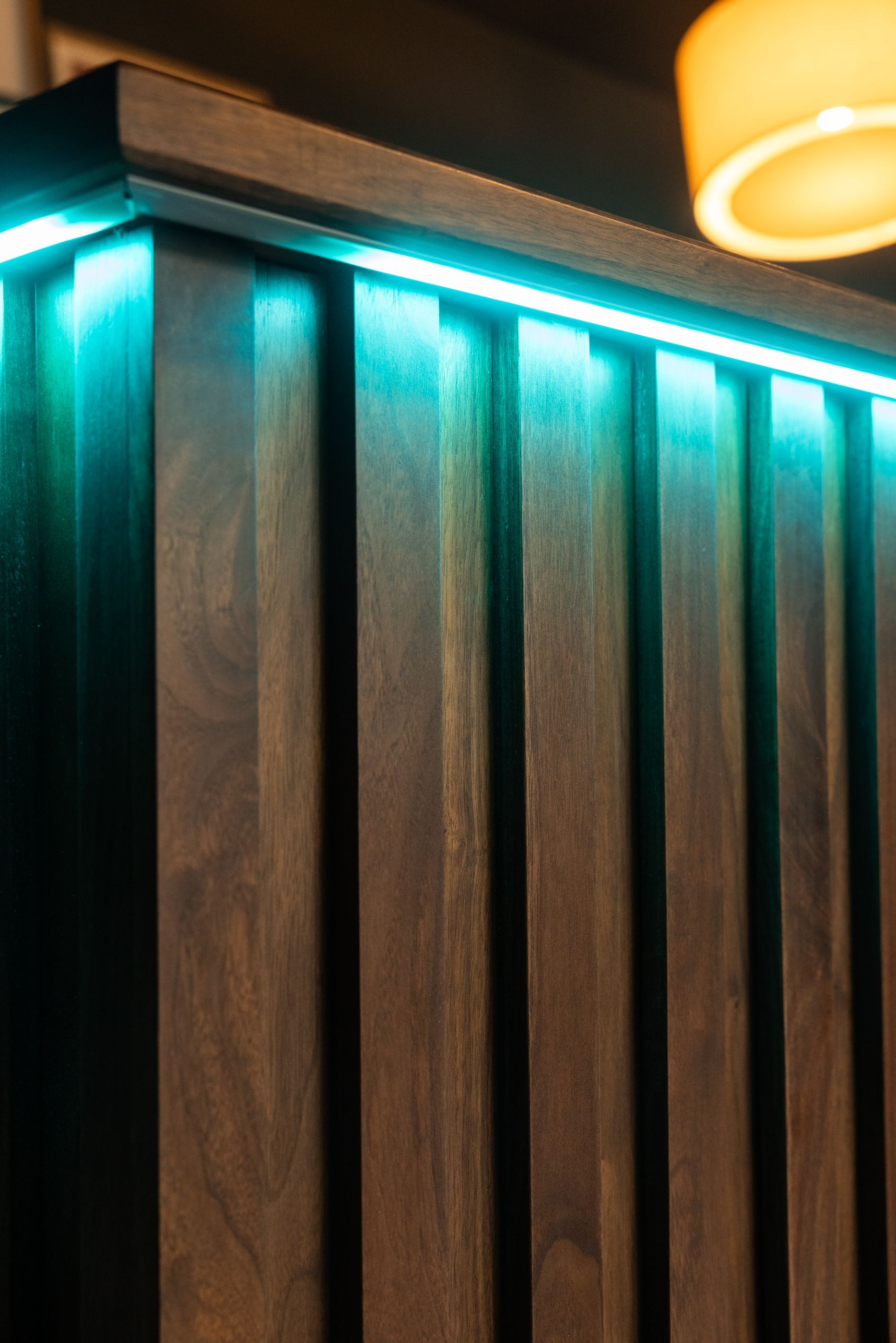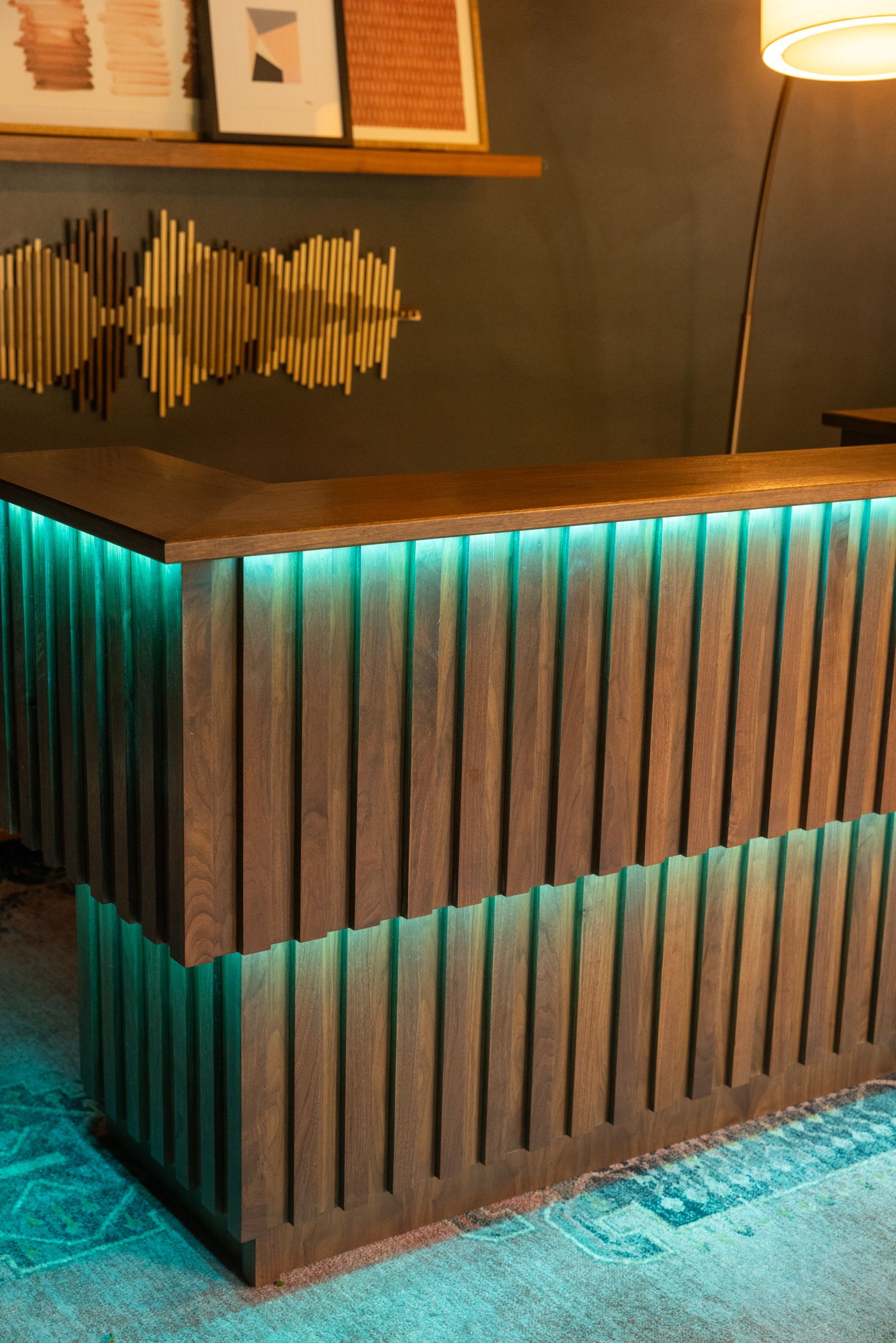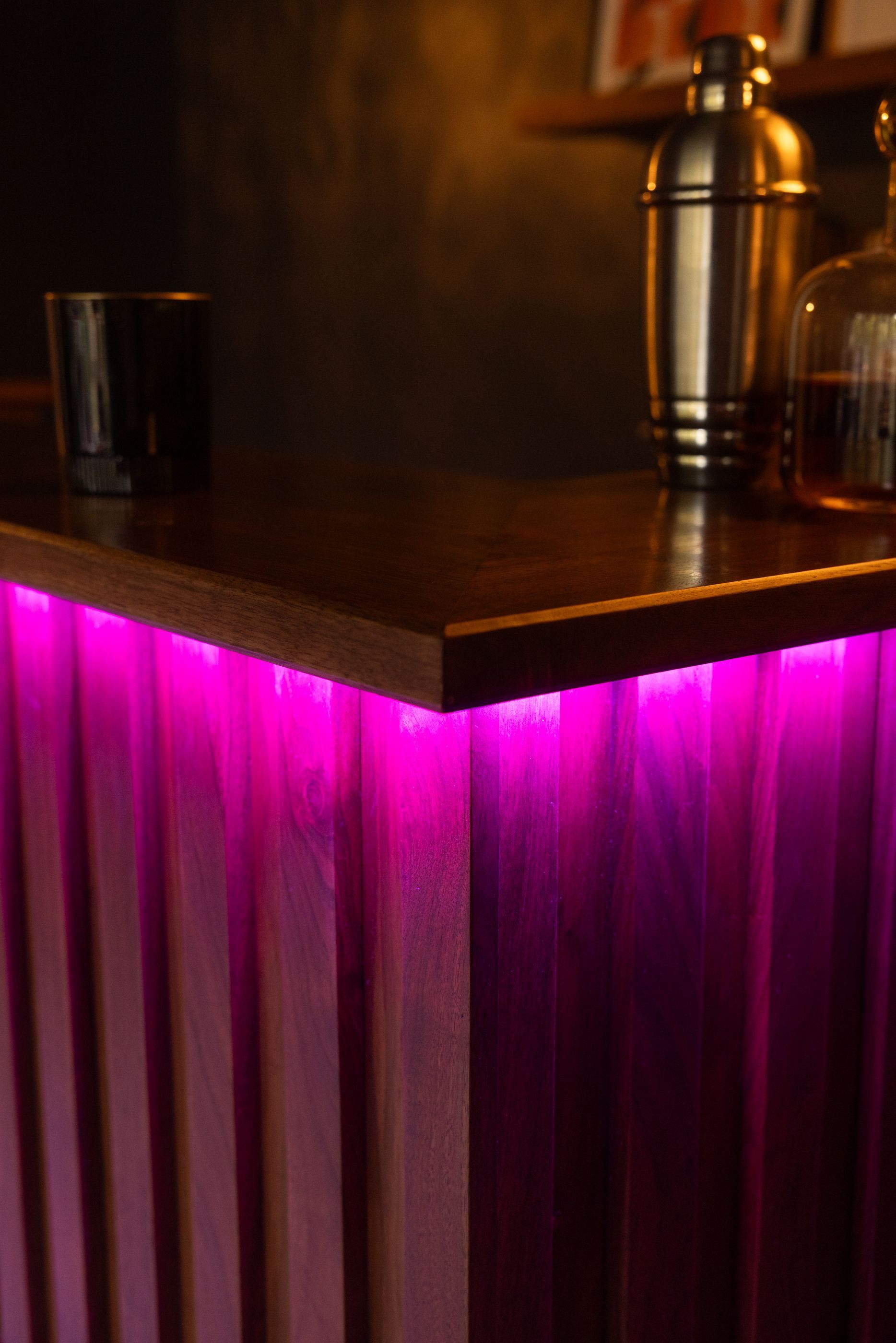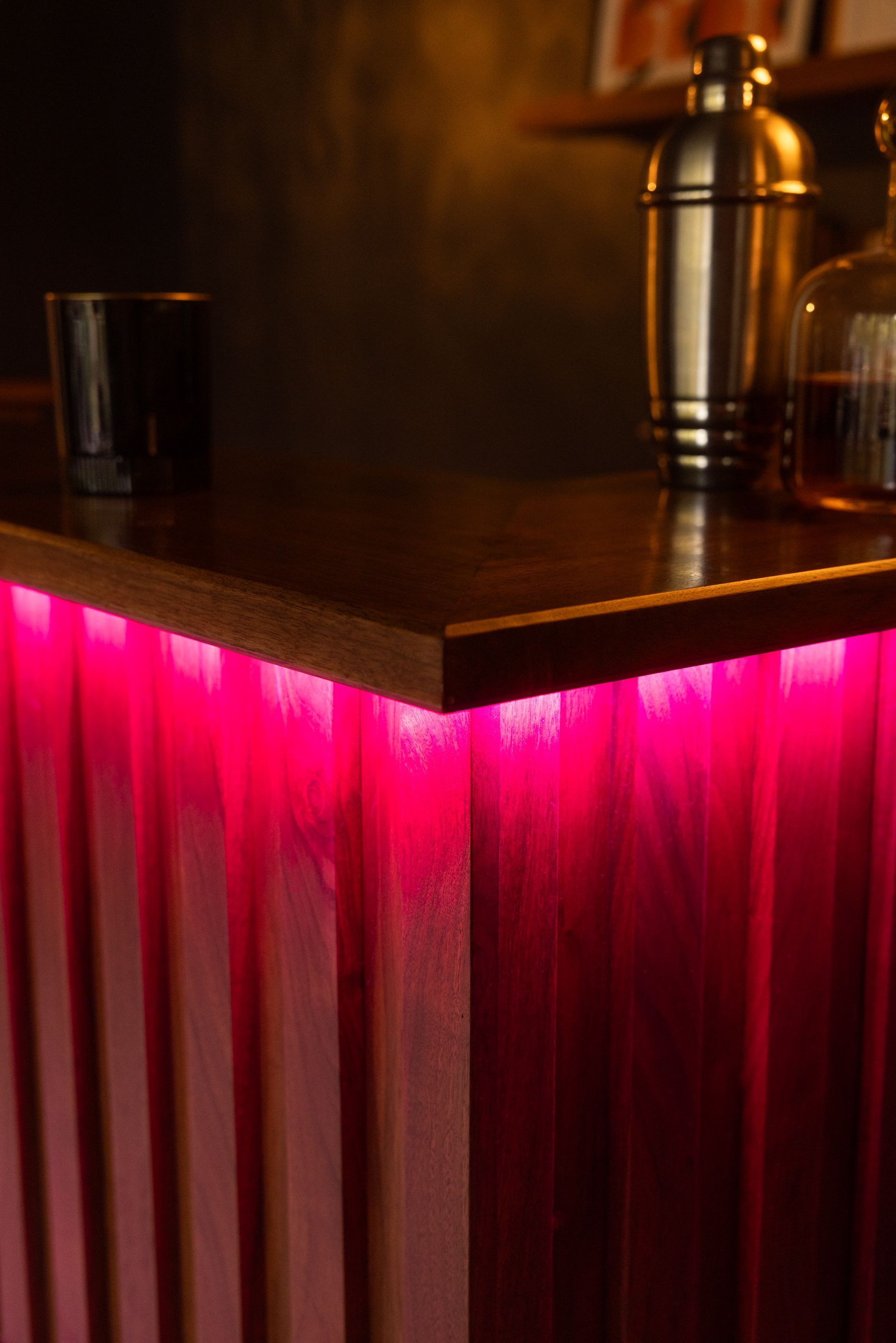 This is the first bar built under the Alessandrini Design label. It features a walnut tambour over walnut panels with our signature stacked array and lighting. The inside cabinets are black textured melamine to serve as a nondescript yet functional back bar. The counters are fabricated of solid walnut planks with a chamfered edge.