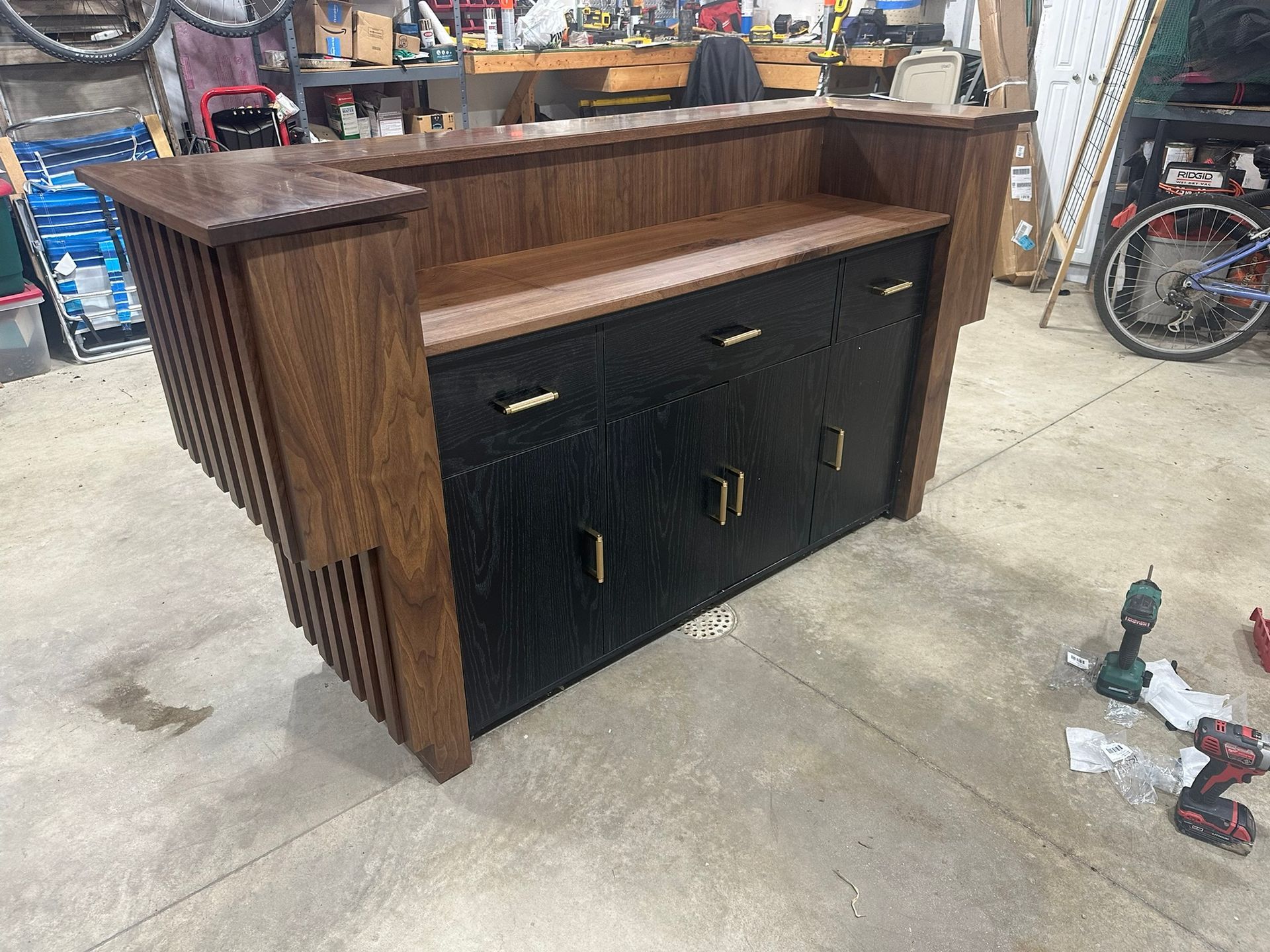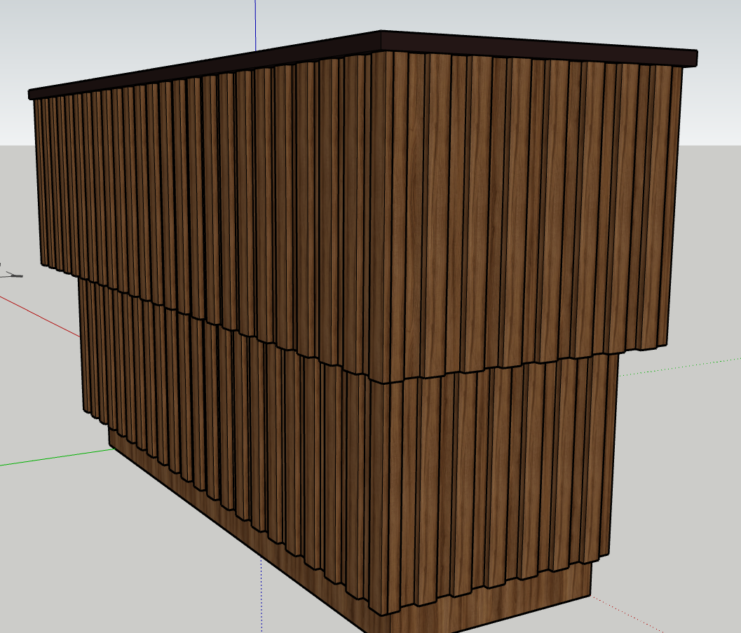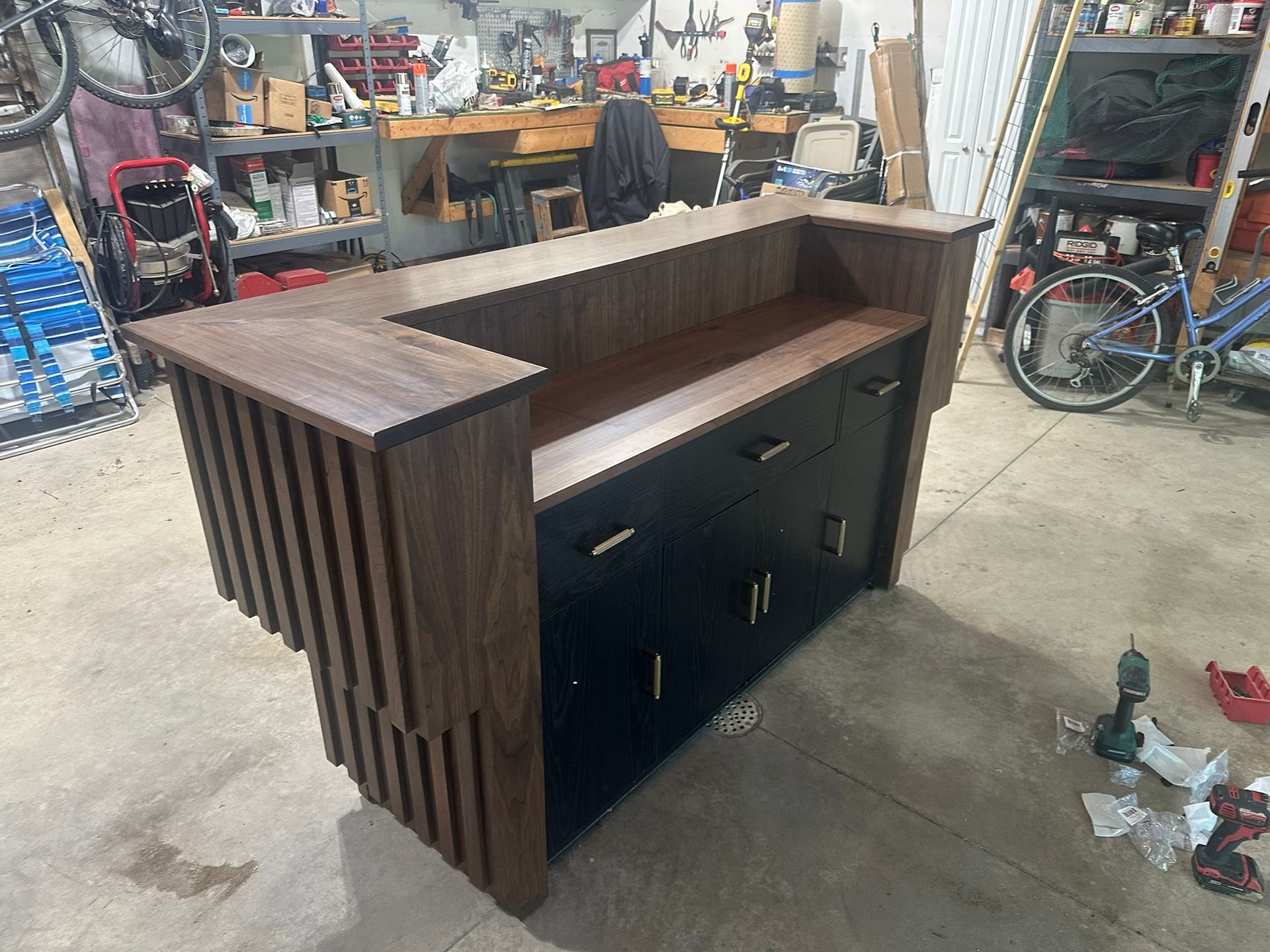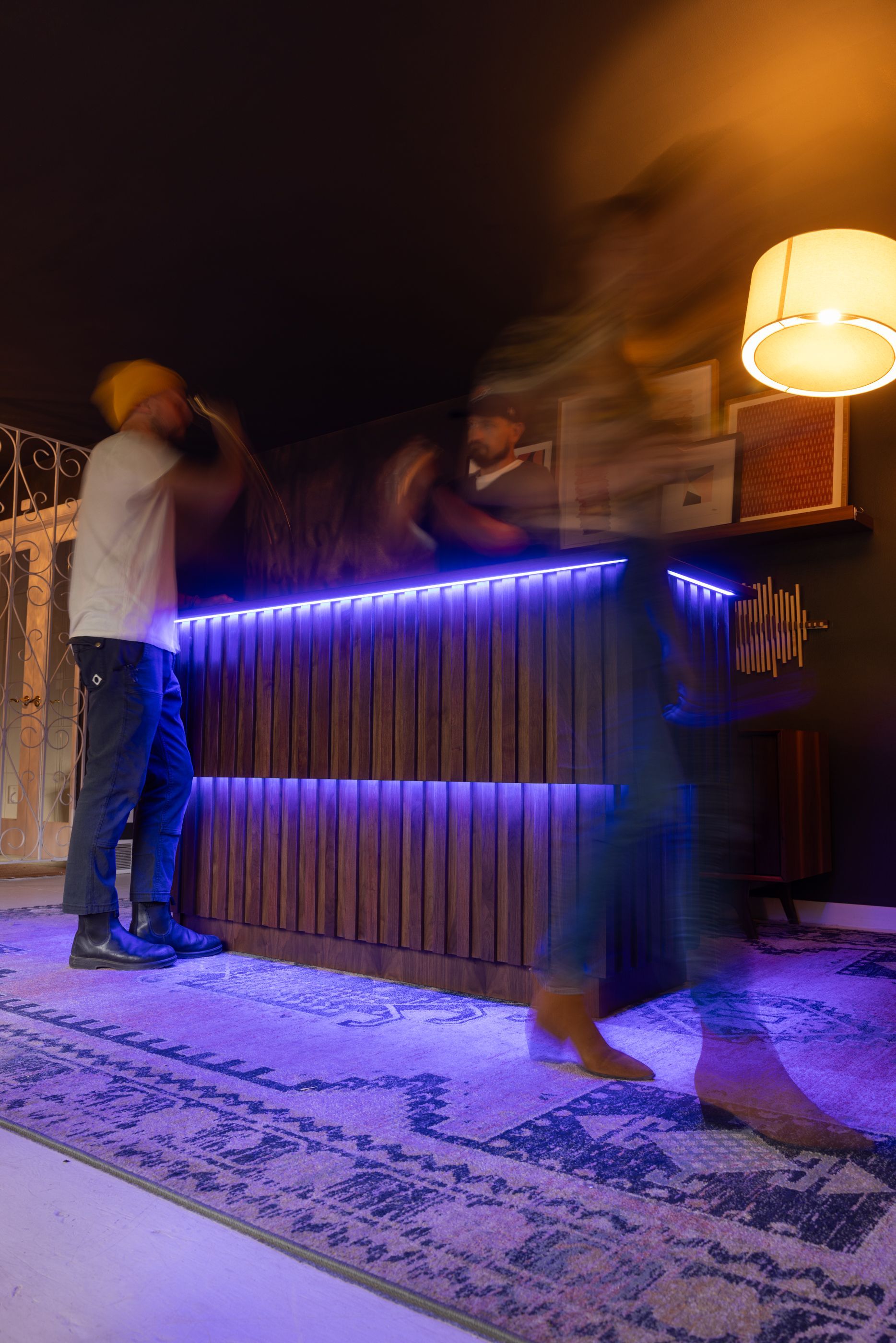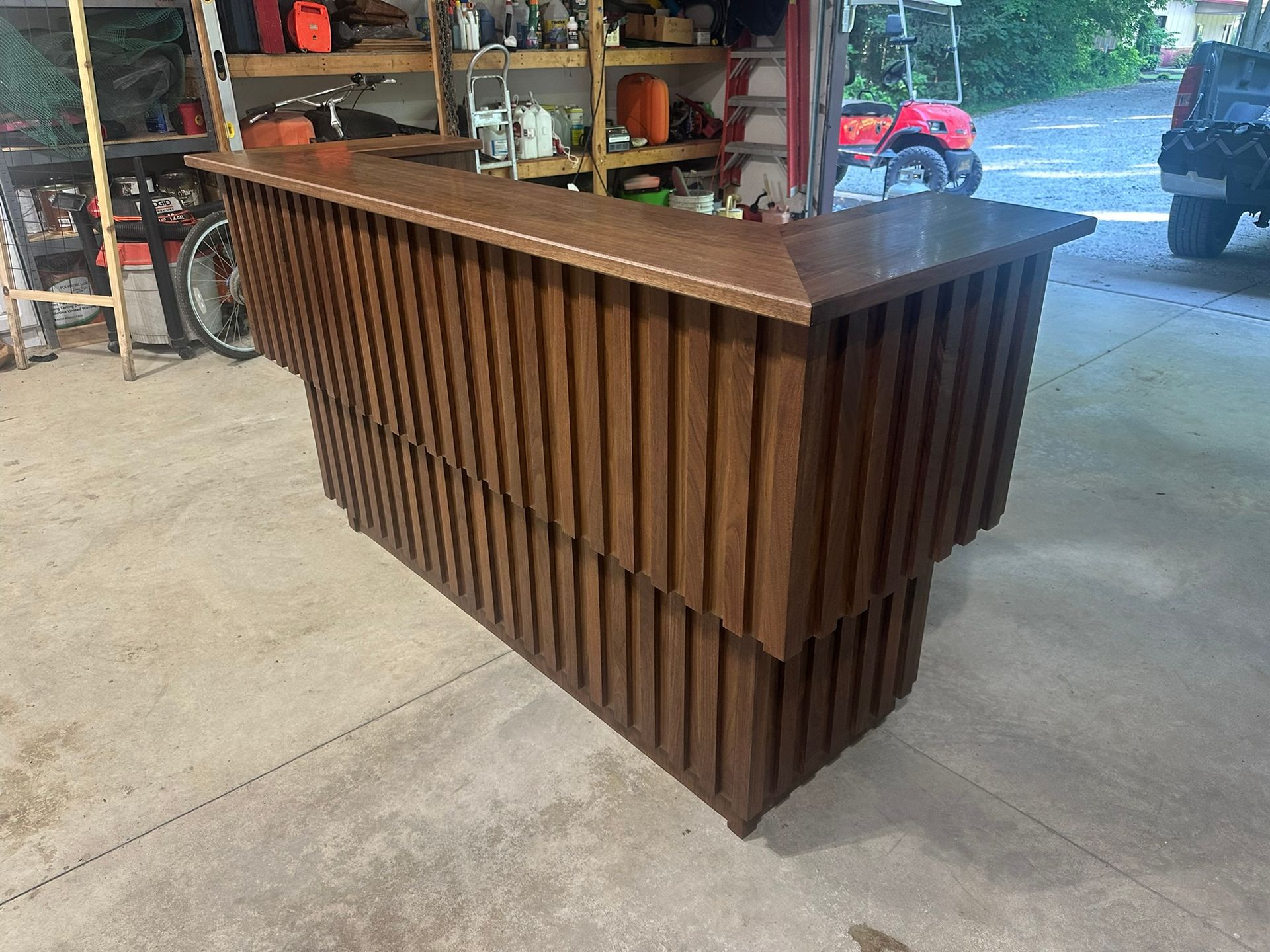 This is the first bar built under the Alessandrini Design label. It features a walnut tambour over walnut panels with our signature stacked array and lighting. The inside cabinets are black textured melamine to serve as a nondescript yet functional back bar. The counters are fabricated of solid walnut planks with a chamfered edge.