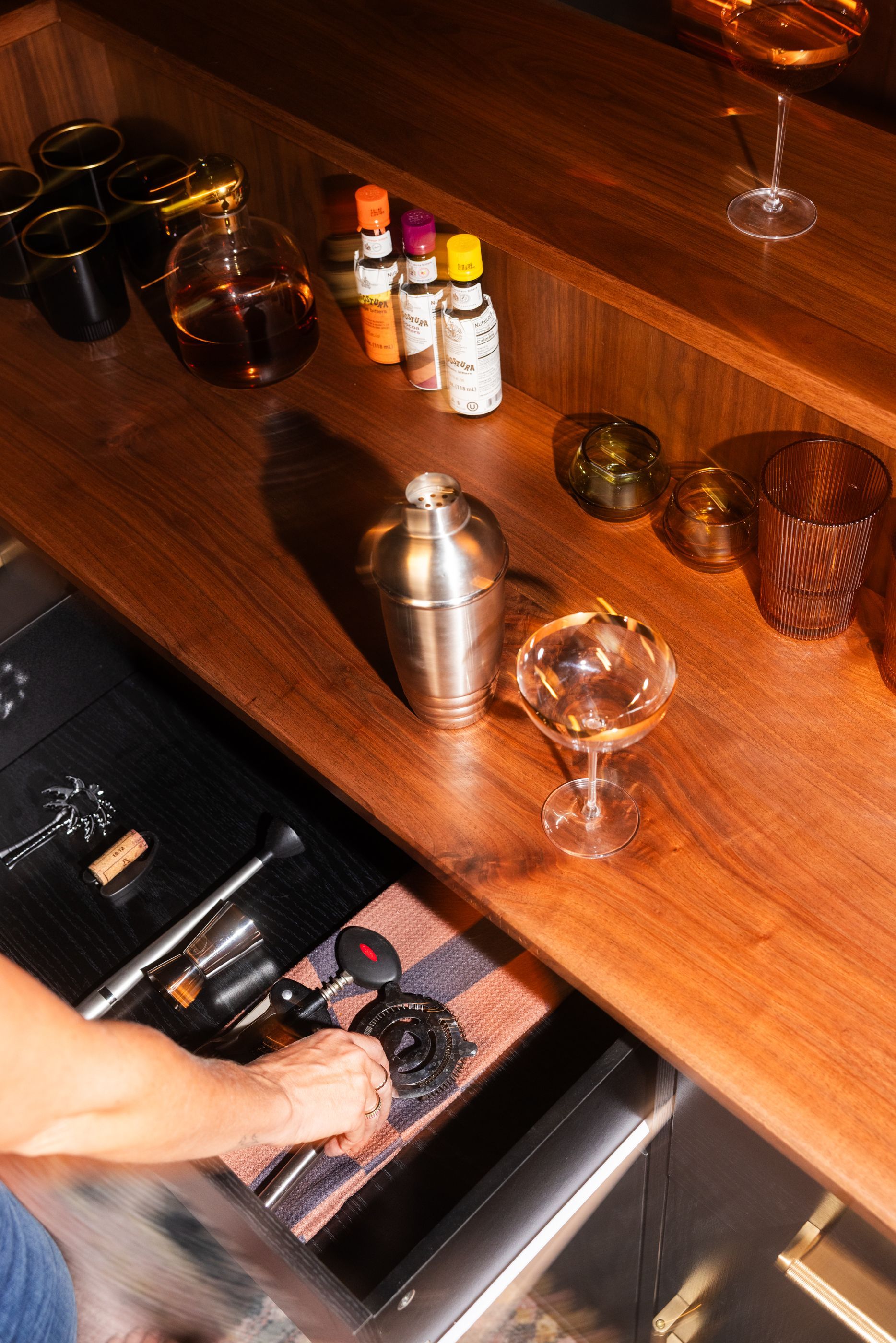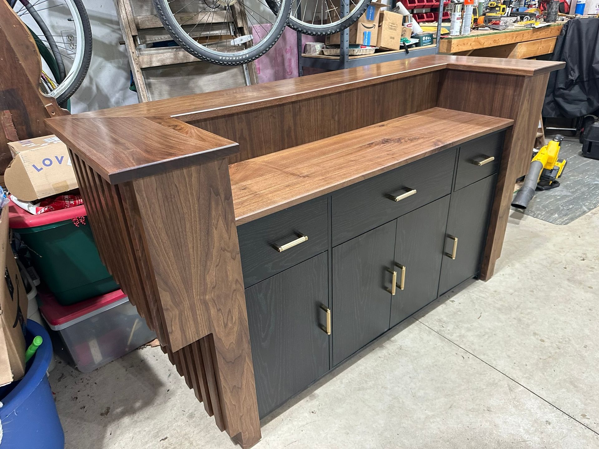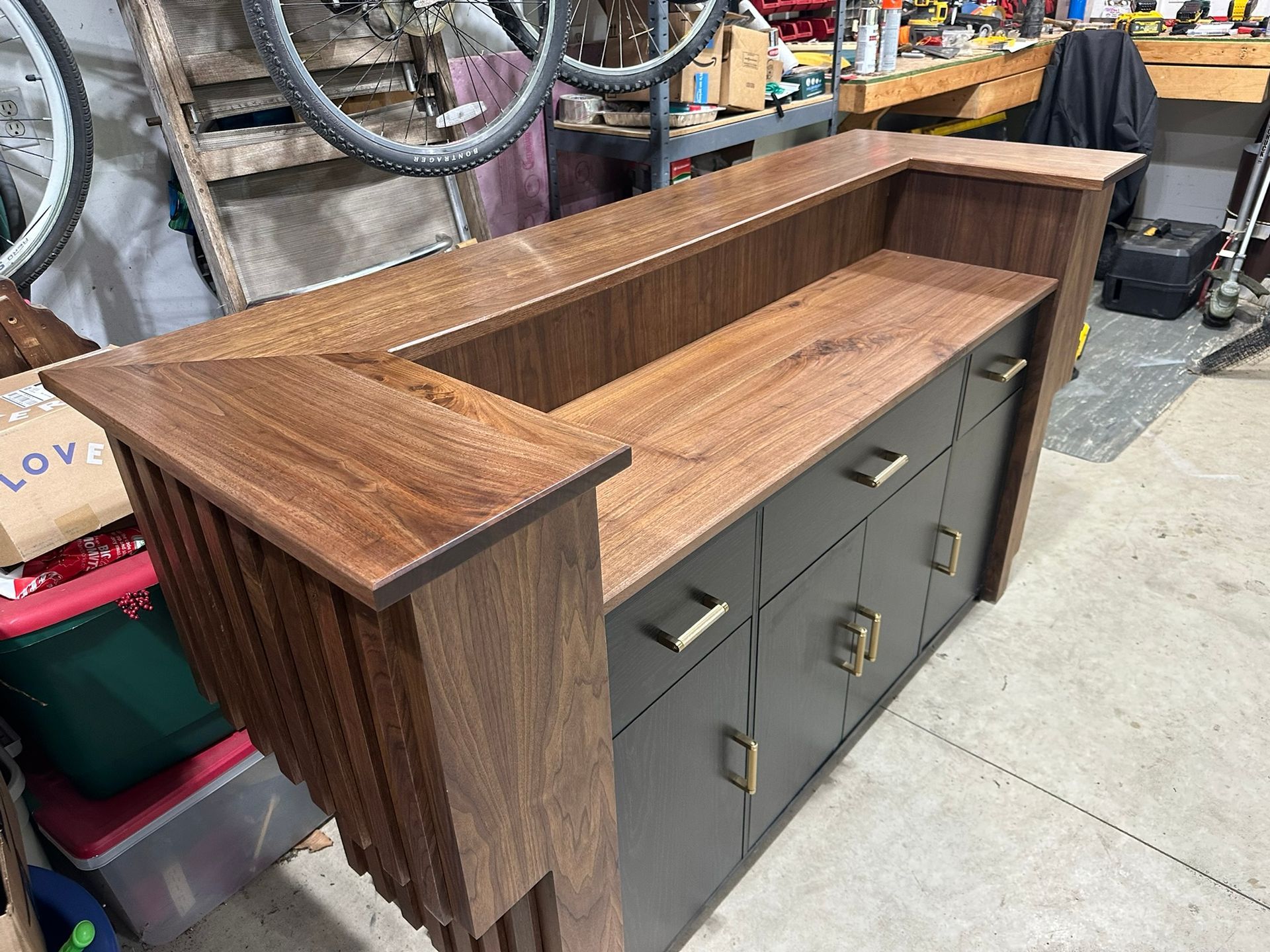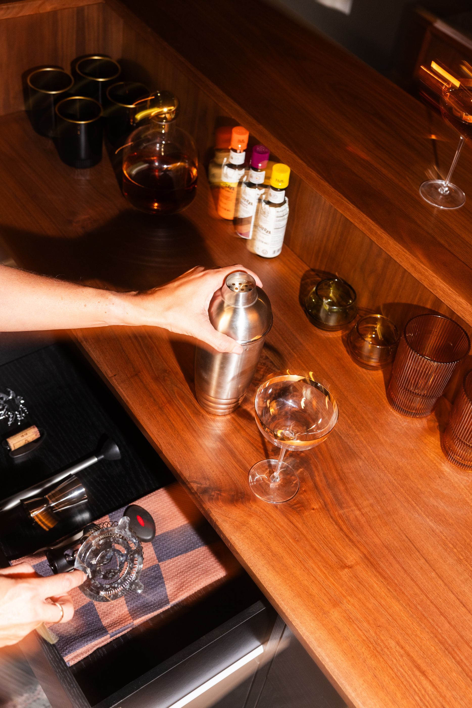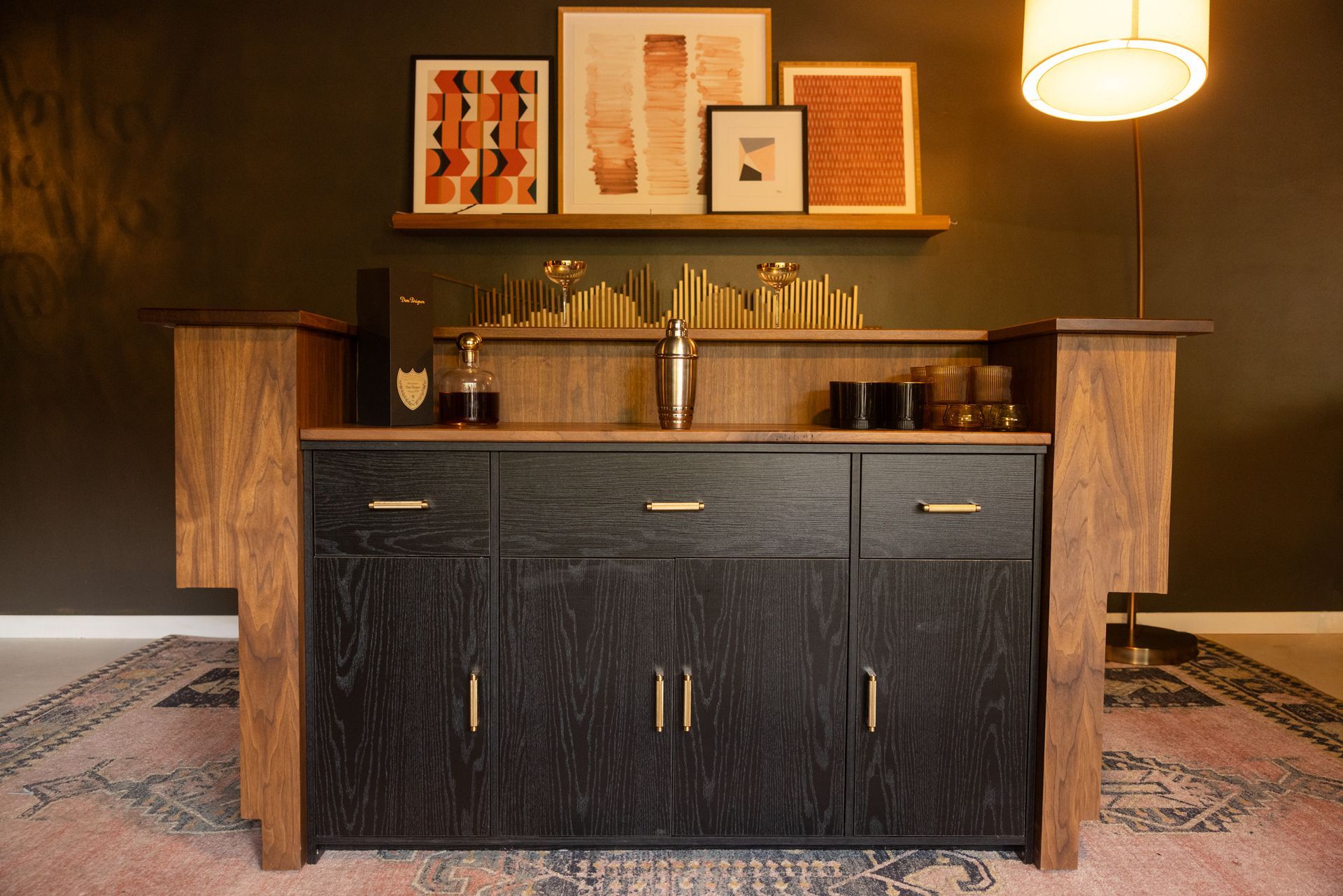 This is the first bar built under the Alessandrini Design label. It features a walnut tambour over walnut panels with our signature stacked array and lighting. The inside cabinets are black textured melamine to serve as a nondescript yet functional back bar. The counters are fabricated of solid walnut planks with a chamfered edge.