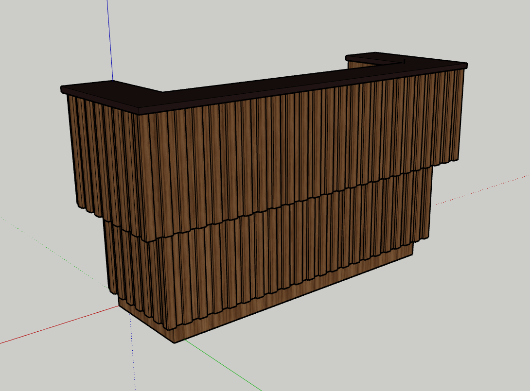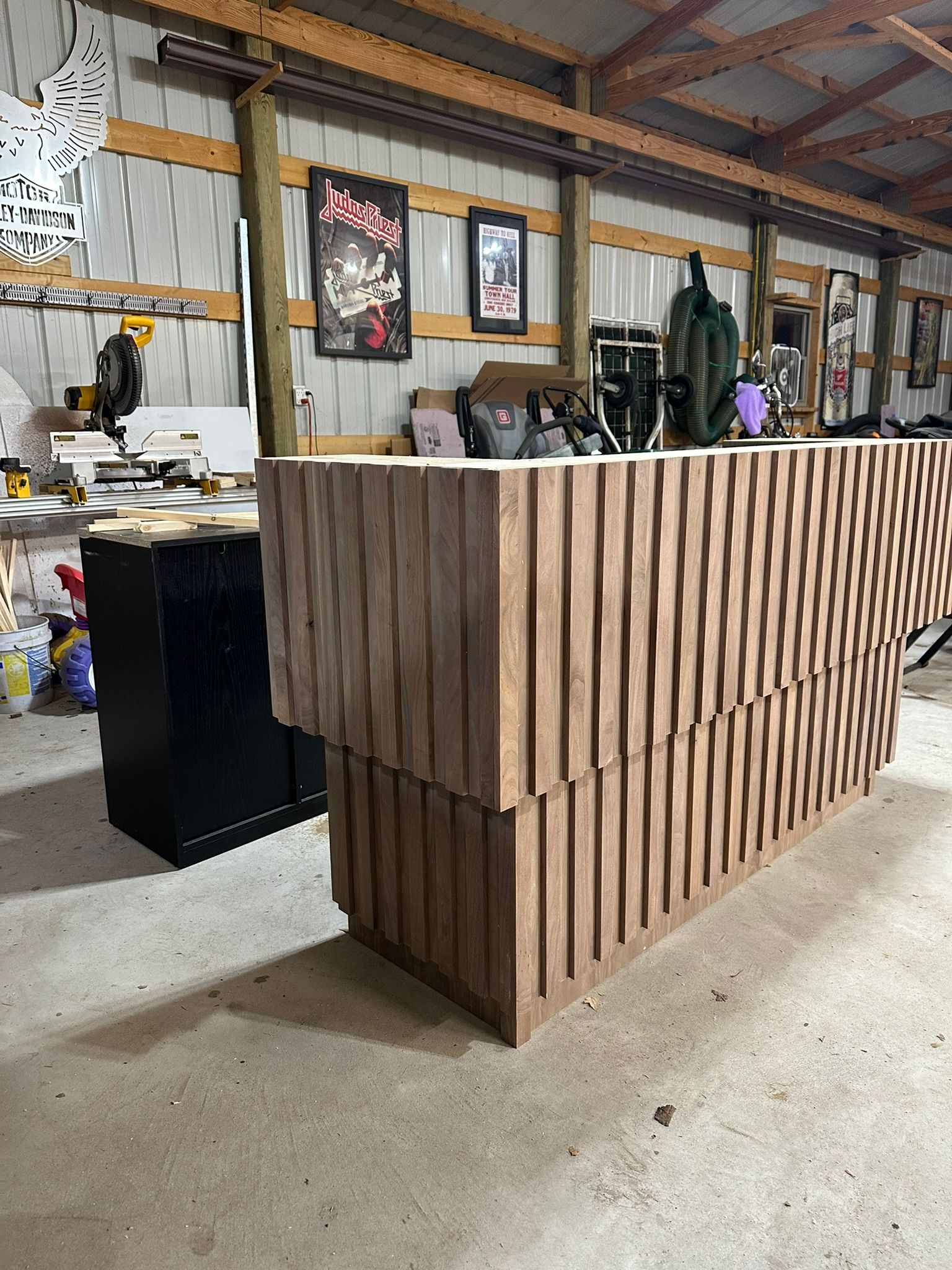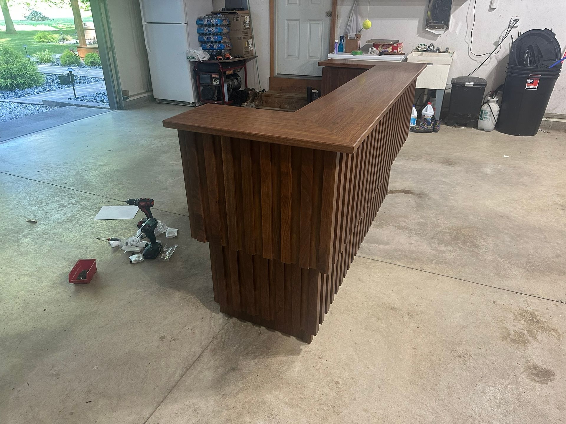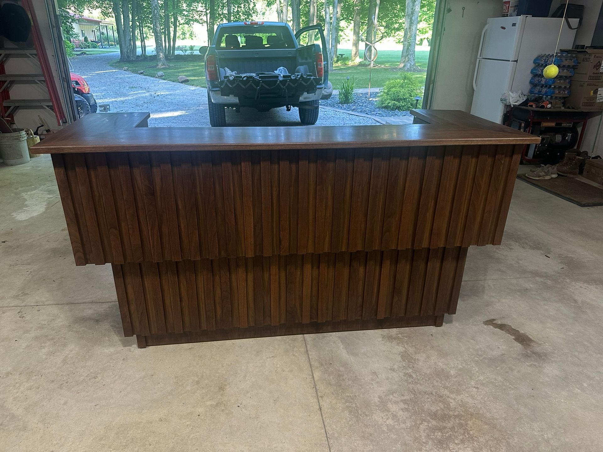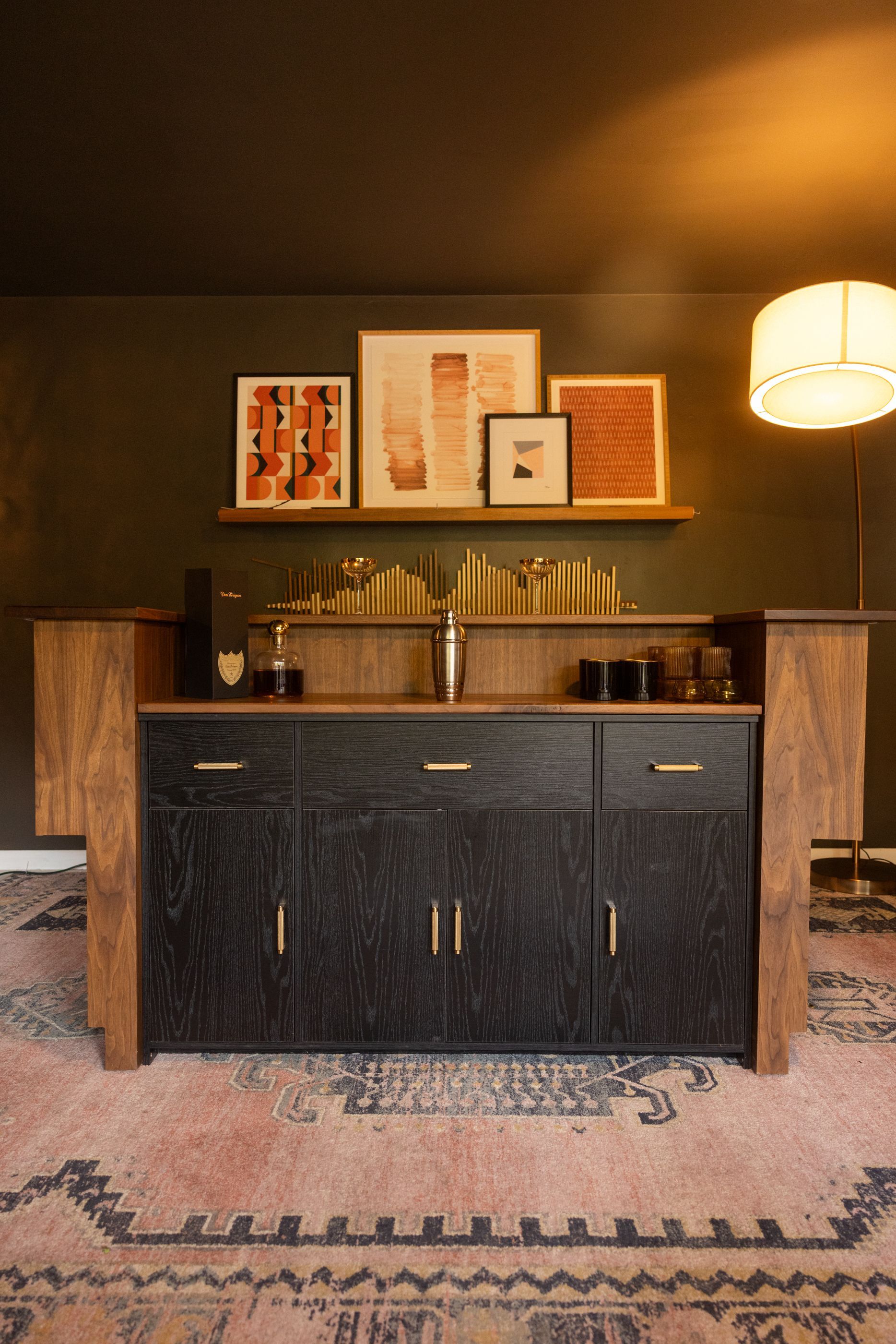 This is the first bar built under the Alessandrini Design label. It features a walnut tambour over walnut panels with our signature stacked array and lighting. The inside cabinets are black textured melamine to serve as a nondescript yet functional back bar. The counters are fabricated of solid walnut planks with a chamfered edge.
