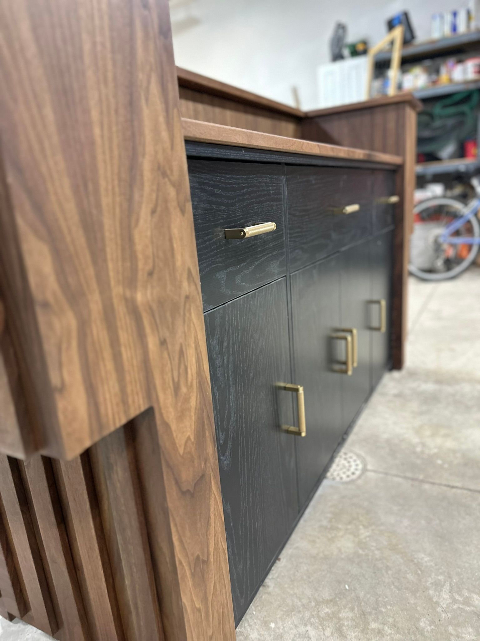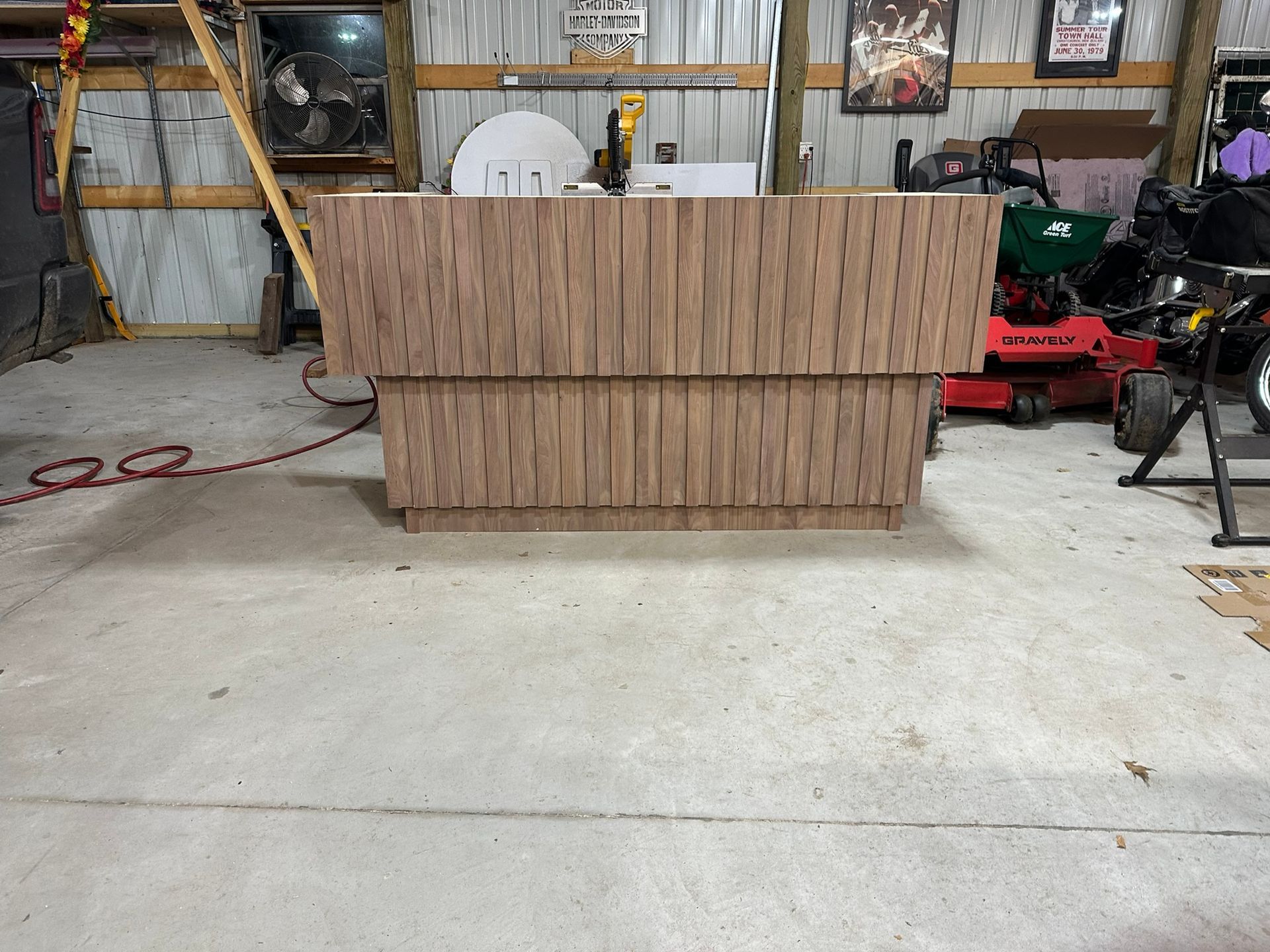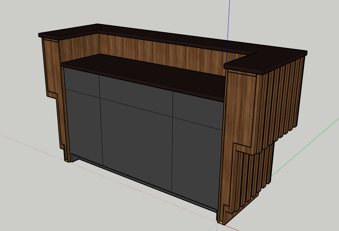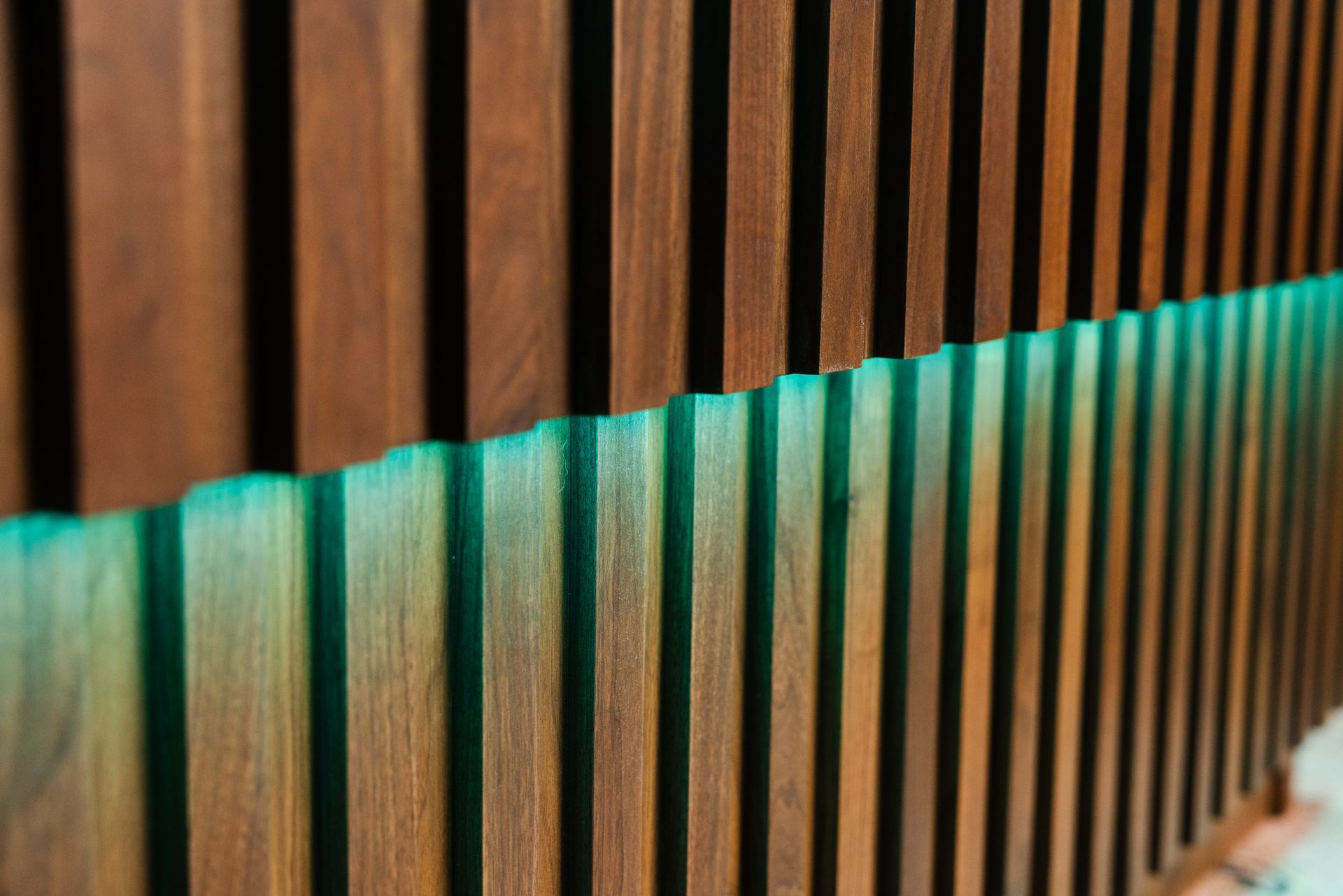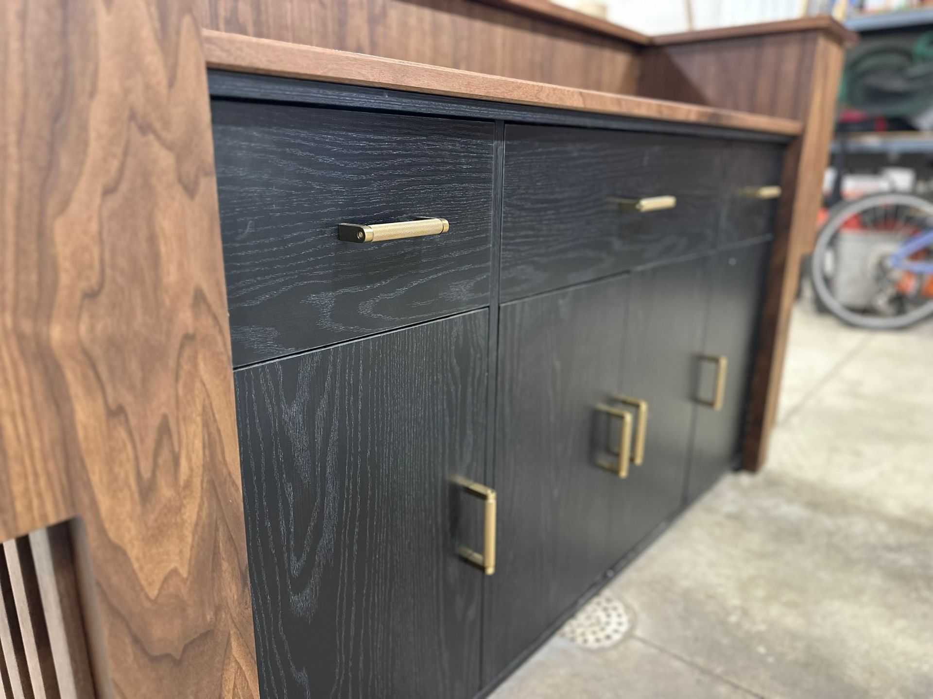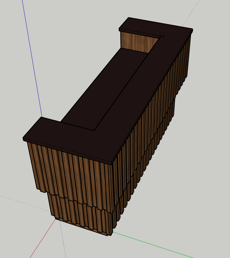 This is the first bar built under the Alessandrini Design label. It features a walnut tambour over walnut panels with our signature stacked array and lighting. The inside cabinets are black textured melamine to serve as a nondescript yet functional back bar. The counters are fabricated of solid walnut planks with a chamfered edge.