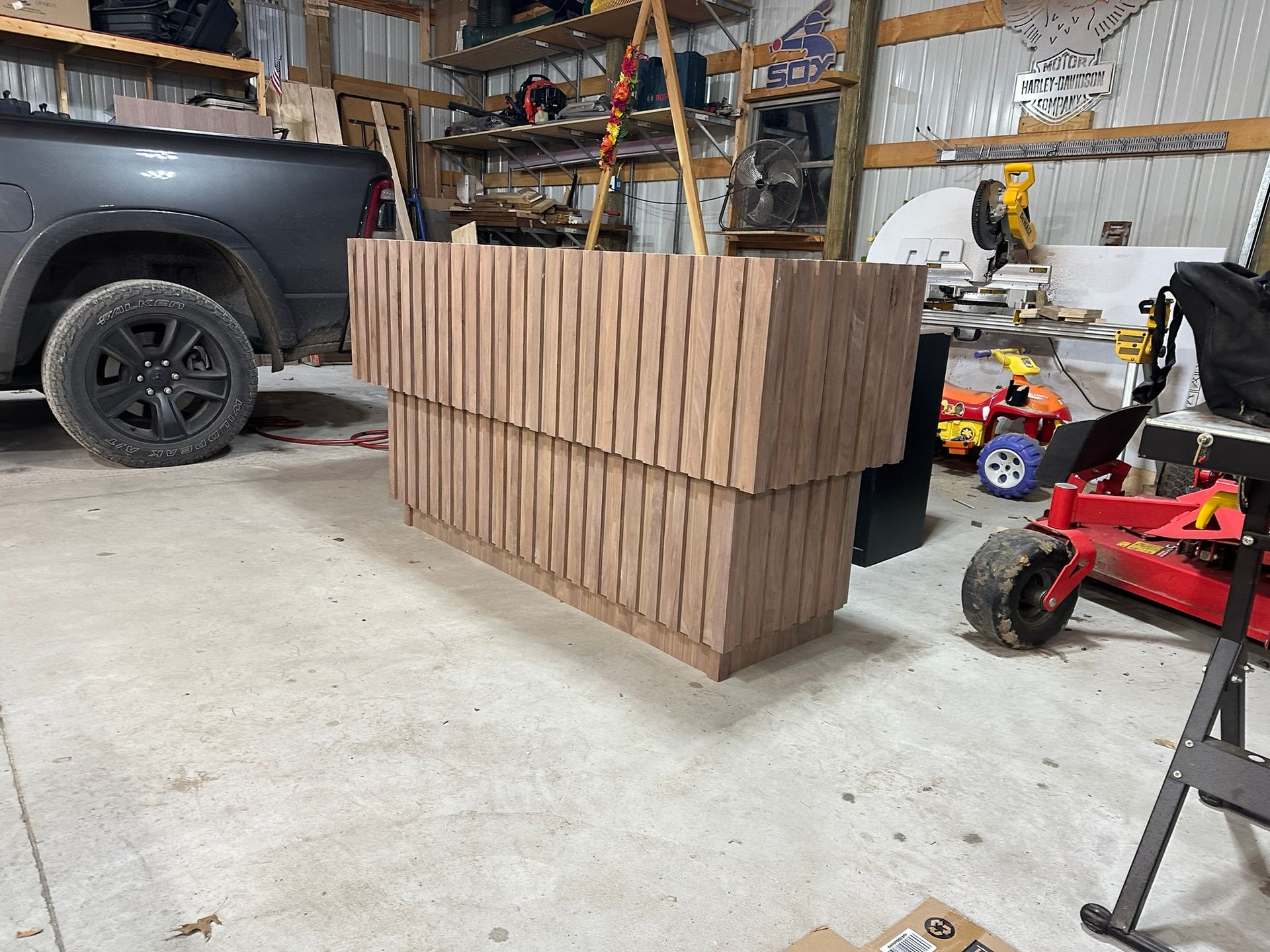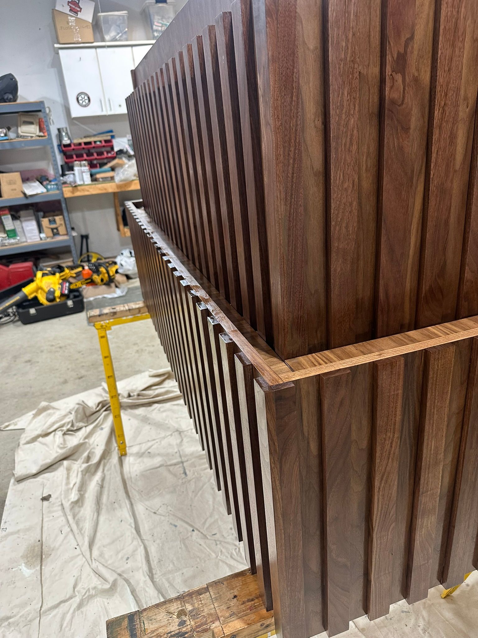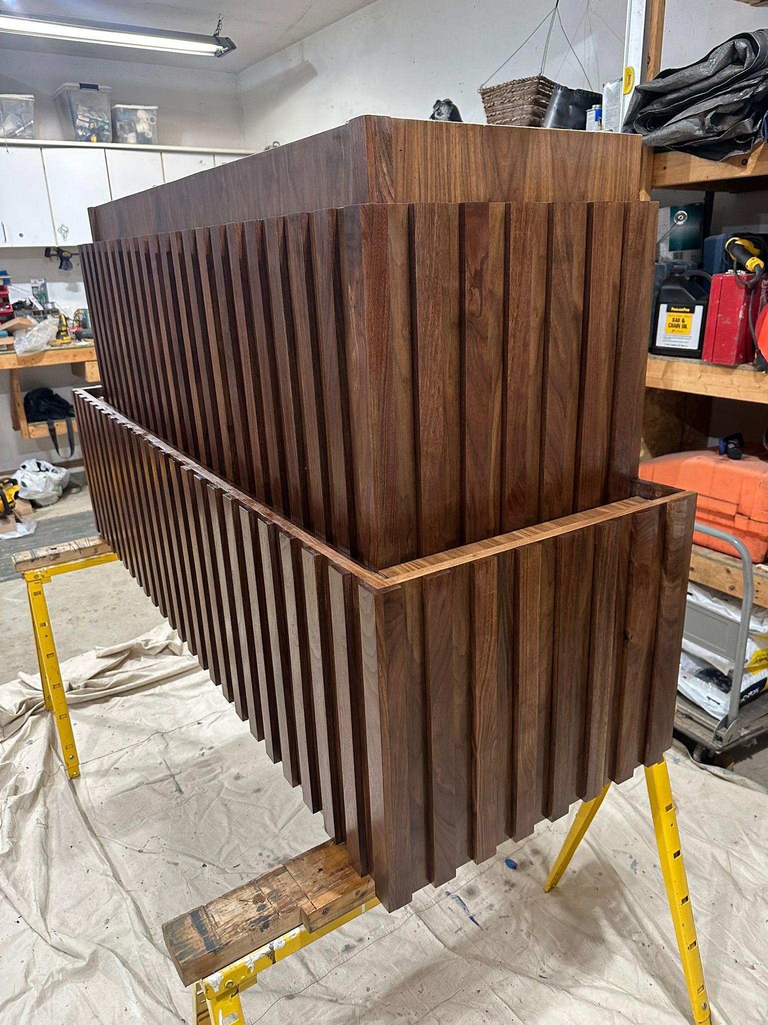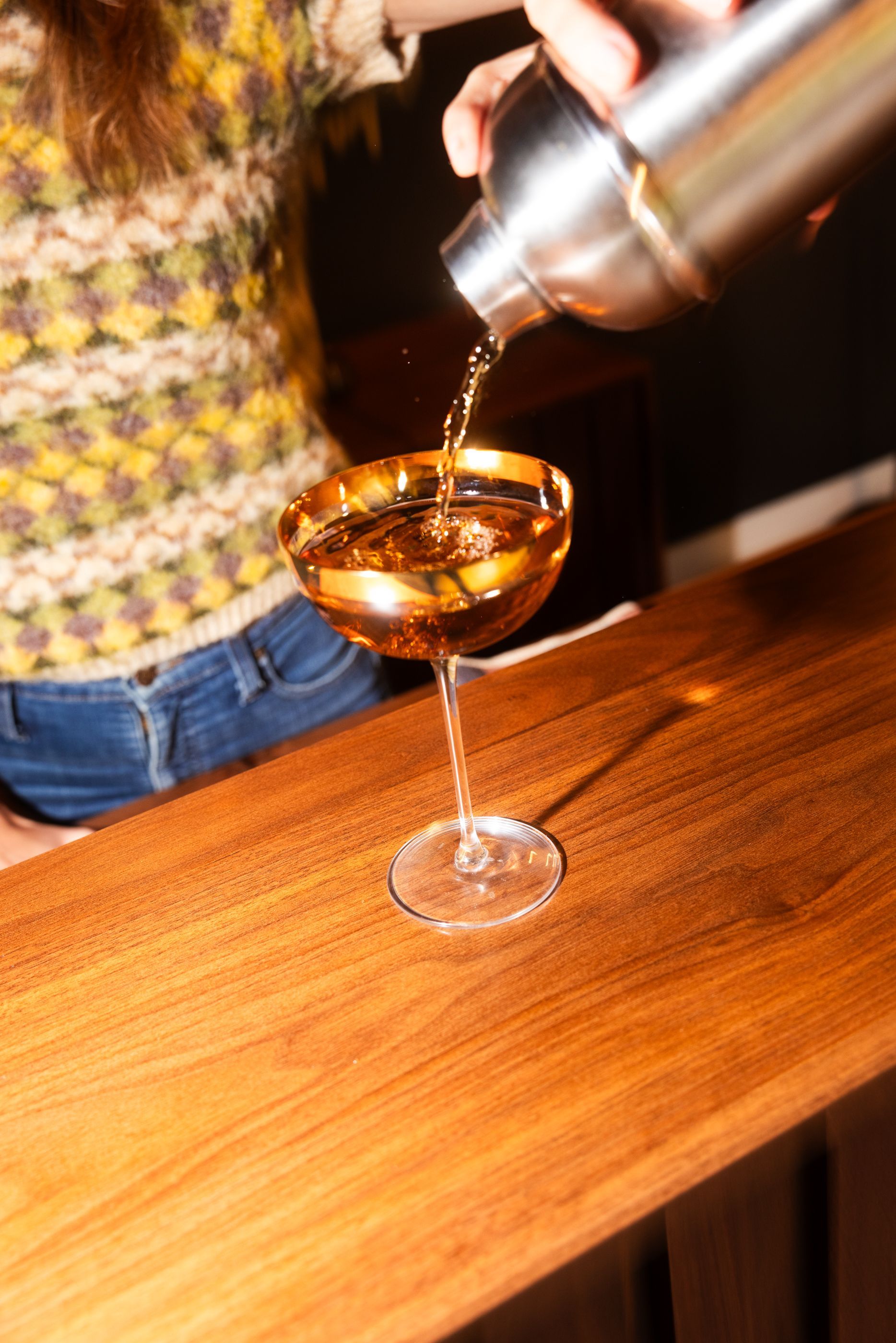 This is the first bar built under the Alessandrini Design label. It features a walnut tambour over walnut panels with our signature stacked array and lighting. The inside cabinets are black textured melamine to serve as a nondescript yet functional back bar. The counters are fabricated of solid walnut planks with a chamfered edge.