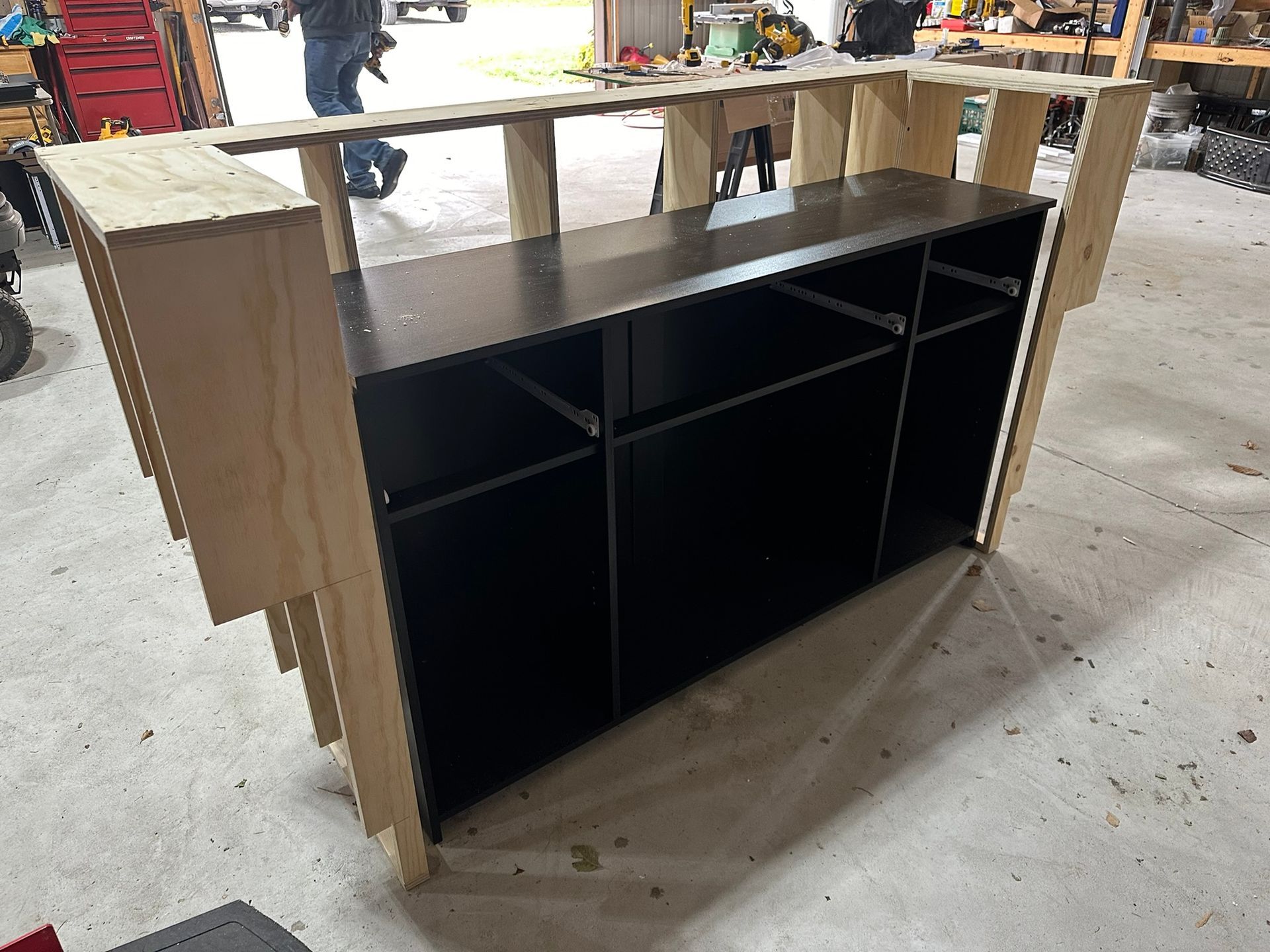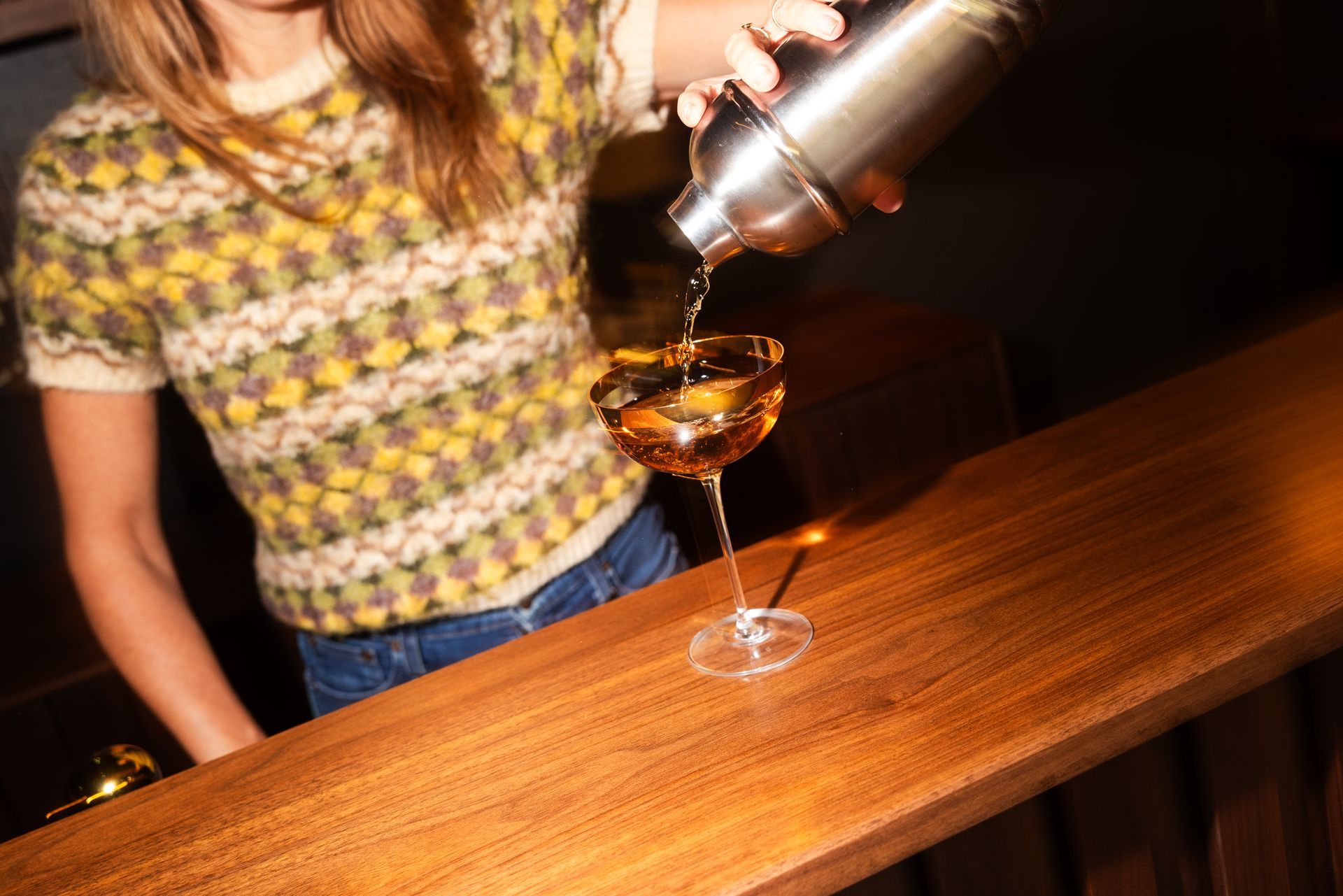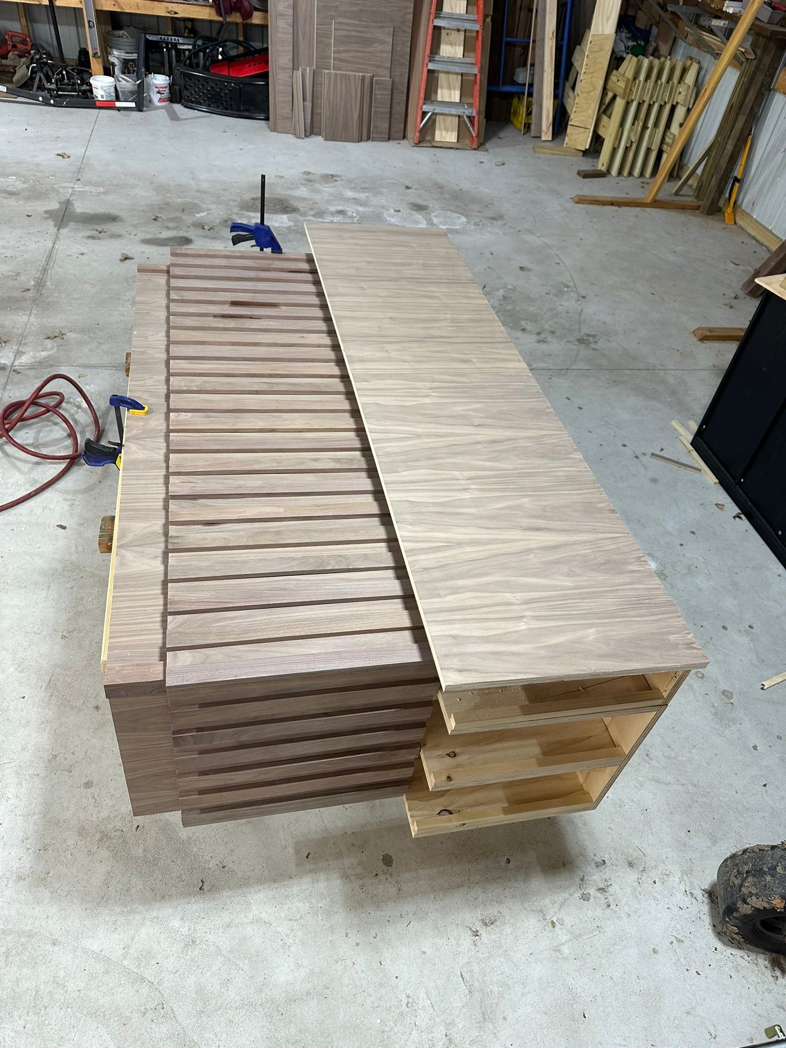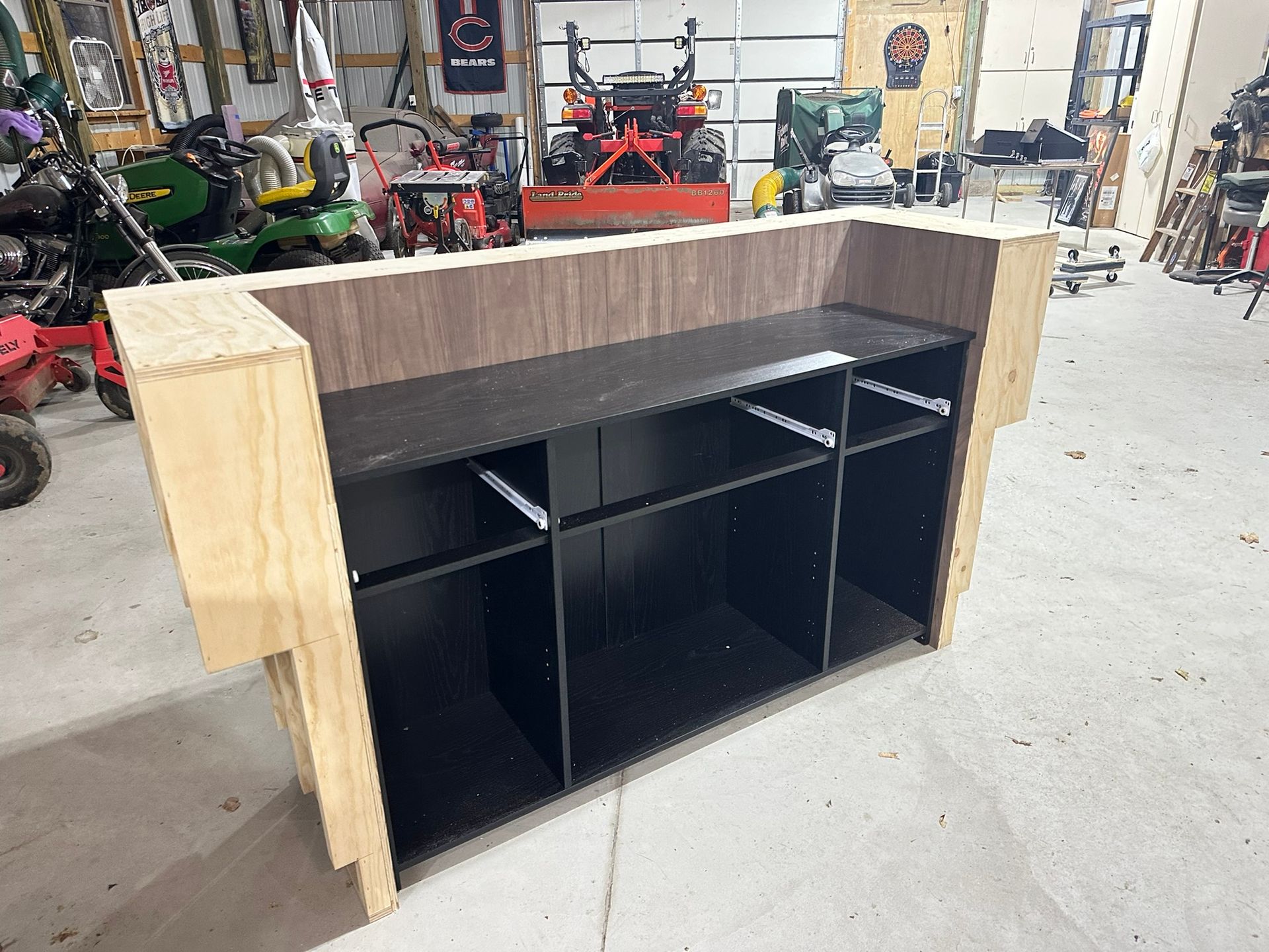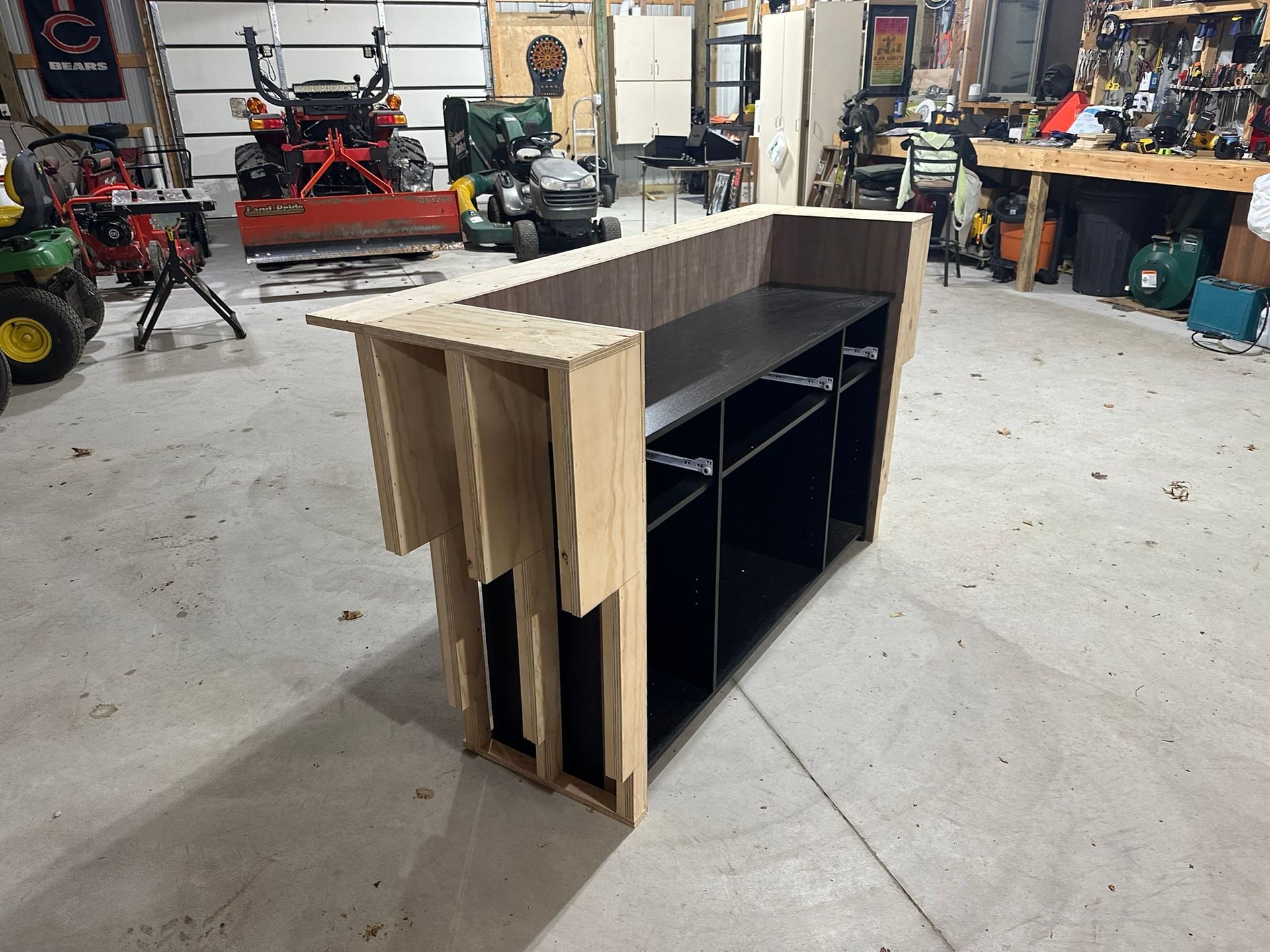 This is the first bar built under the Alessandrini Design label. It features a walnut tambour over walnut panels with our signature stacked array and lighting. The inside cabinets are black textured melamine to serve as a nondescript yet functional back bar. The counters are fabricated of solid walnut planks with a chamfered edge.