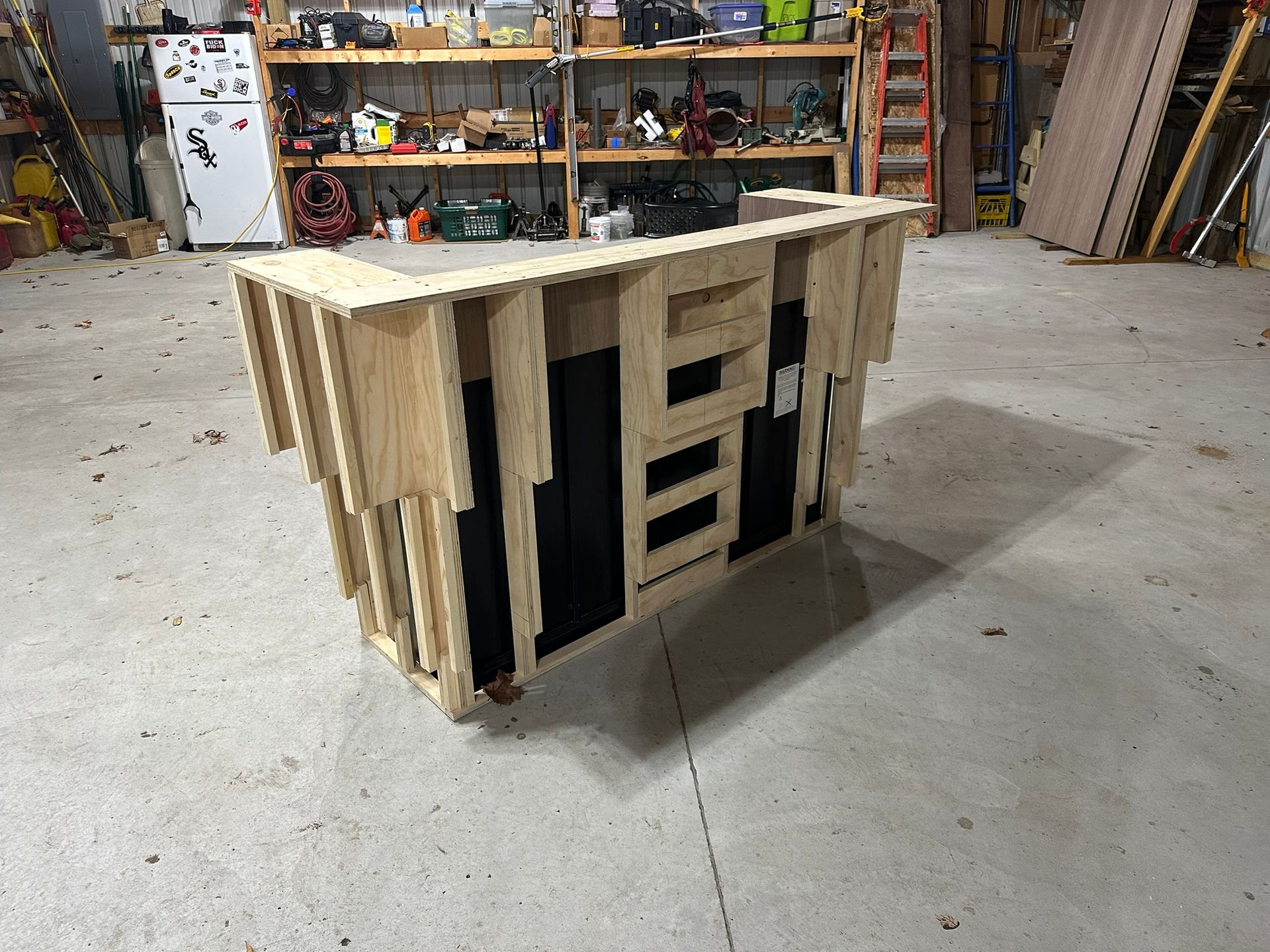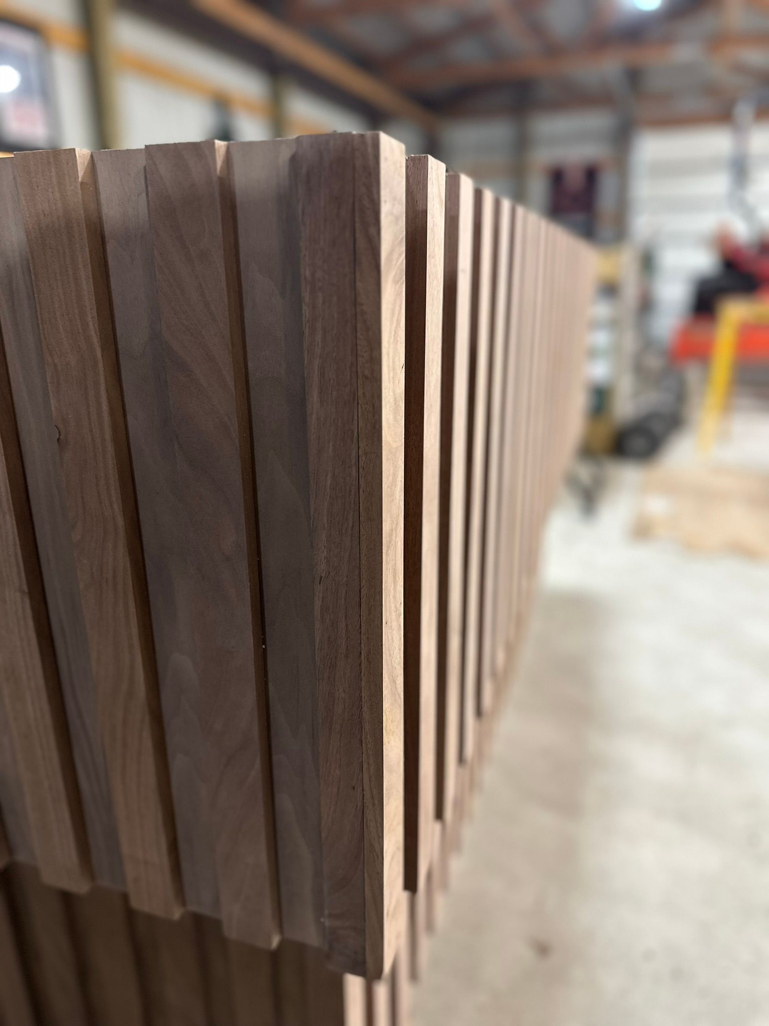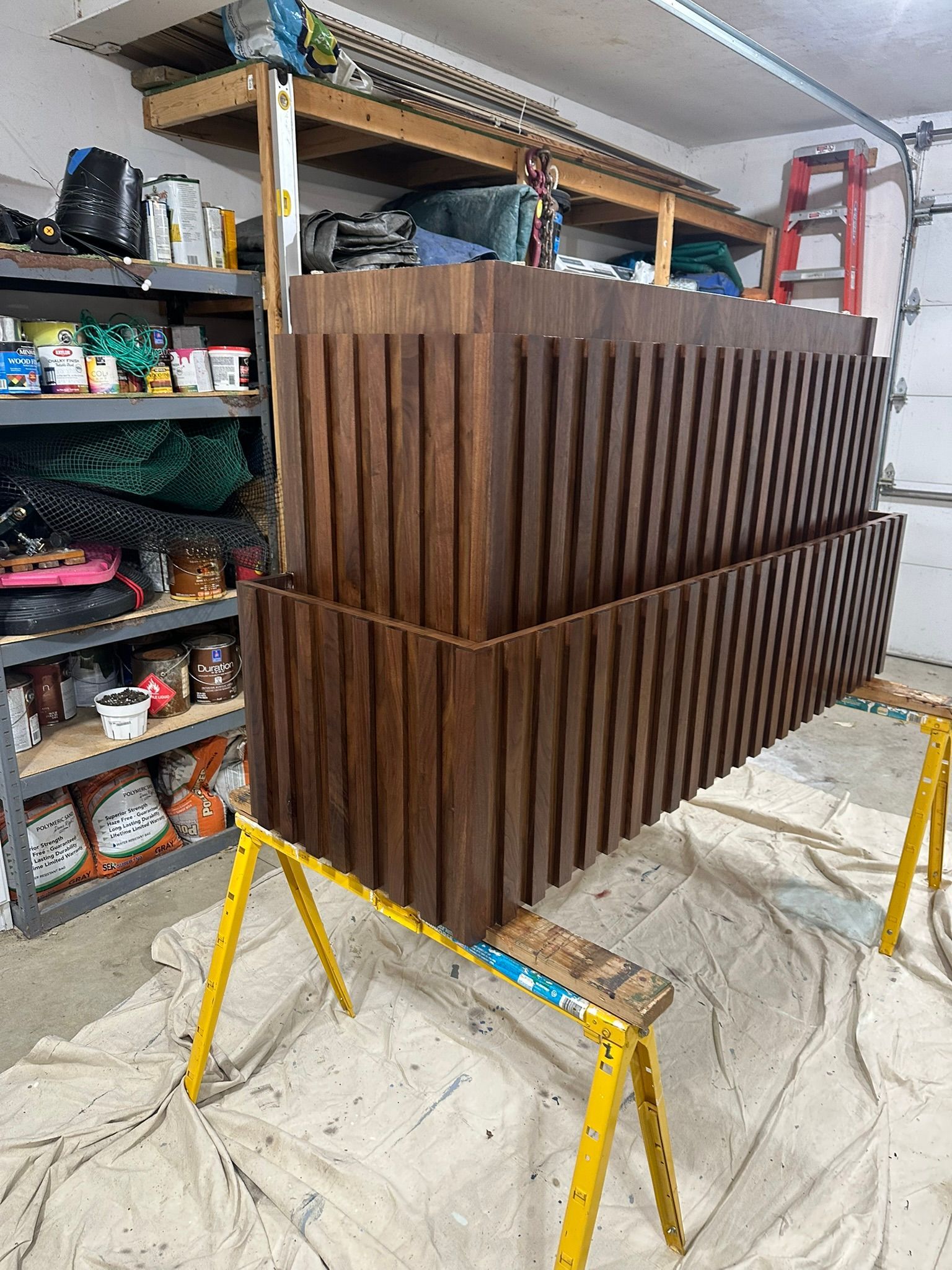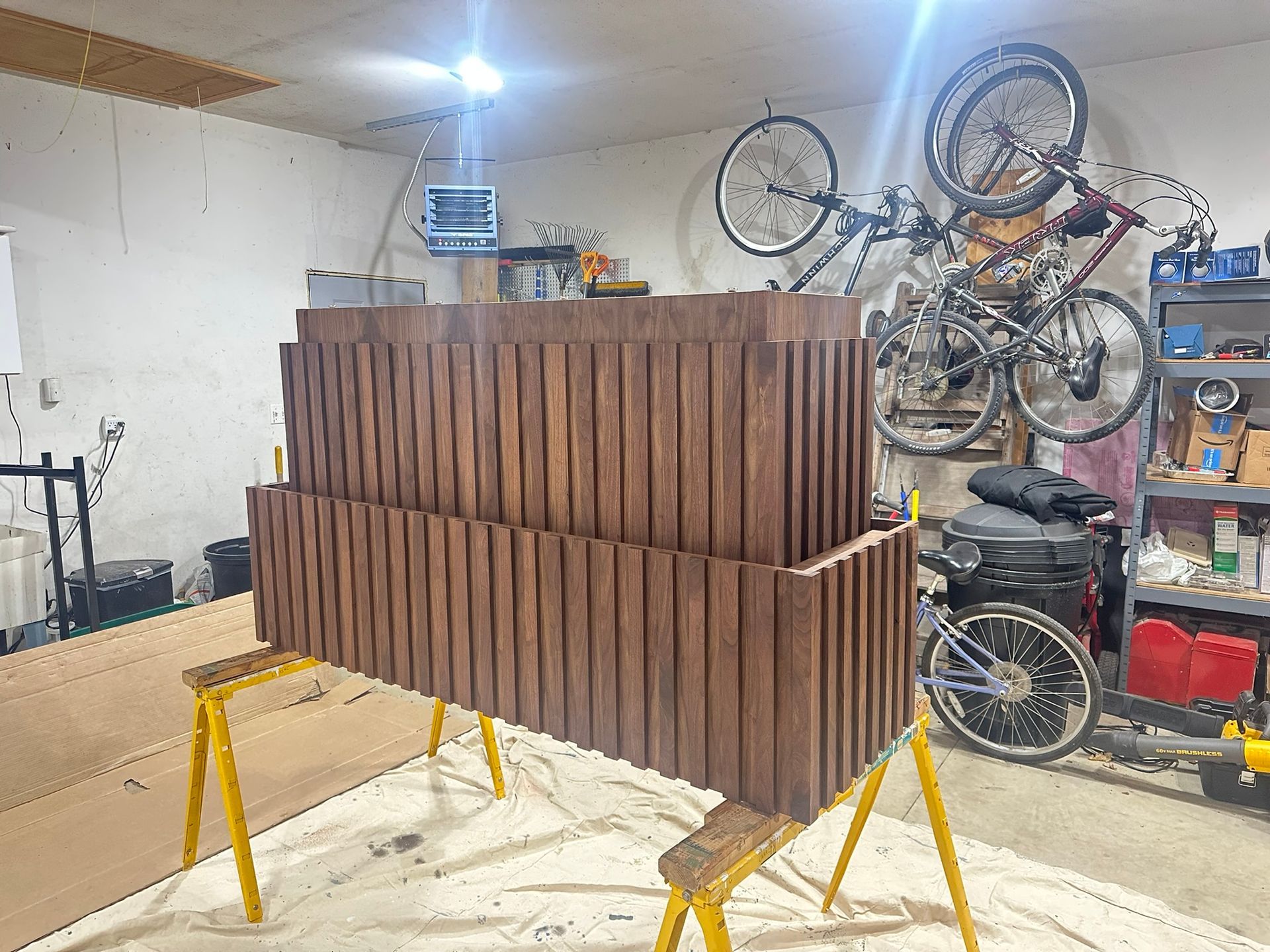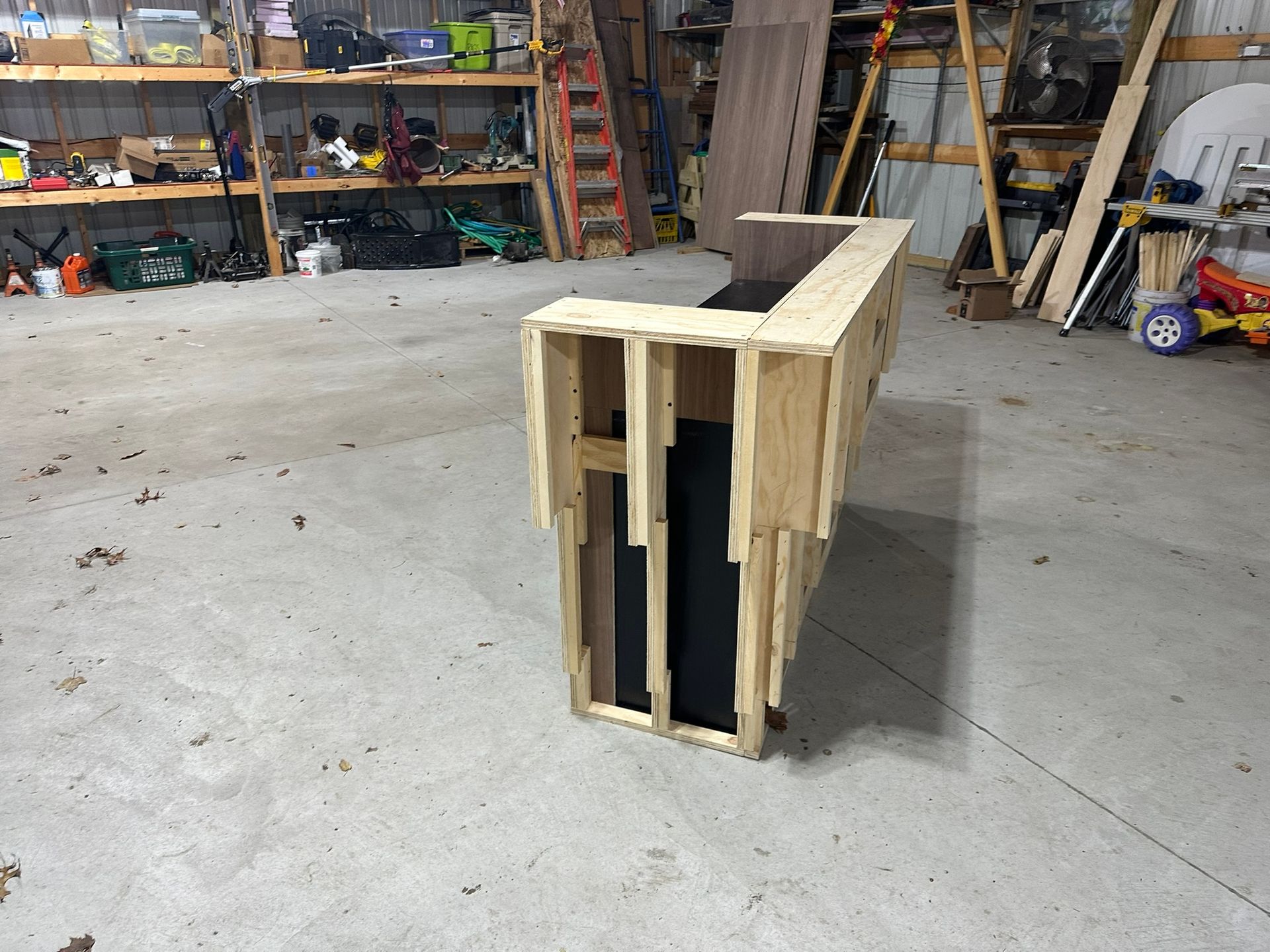 This is the first bar built under the Alessandrini Design label. It features a walnut tambour over walnut panels with our signature stacked array and lighting. The inside cabinets are black textured melamine to serve as a nondescript yet functional back bar. The counters are fabricated of solid walnut planks with a chamfered edge.