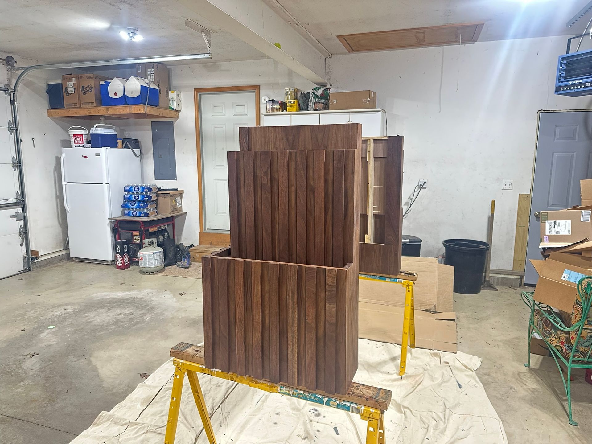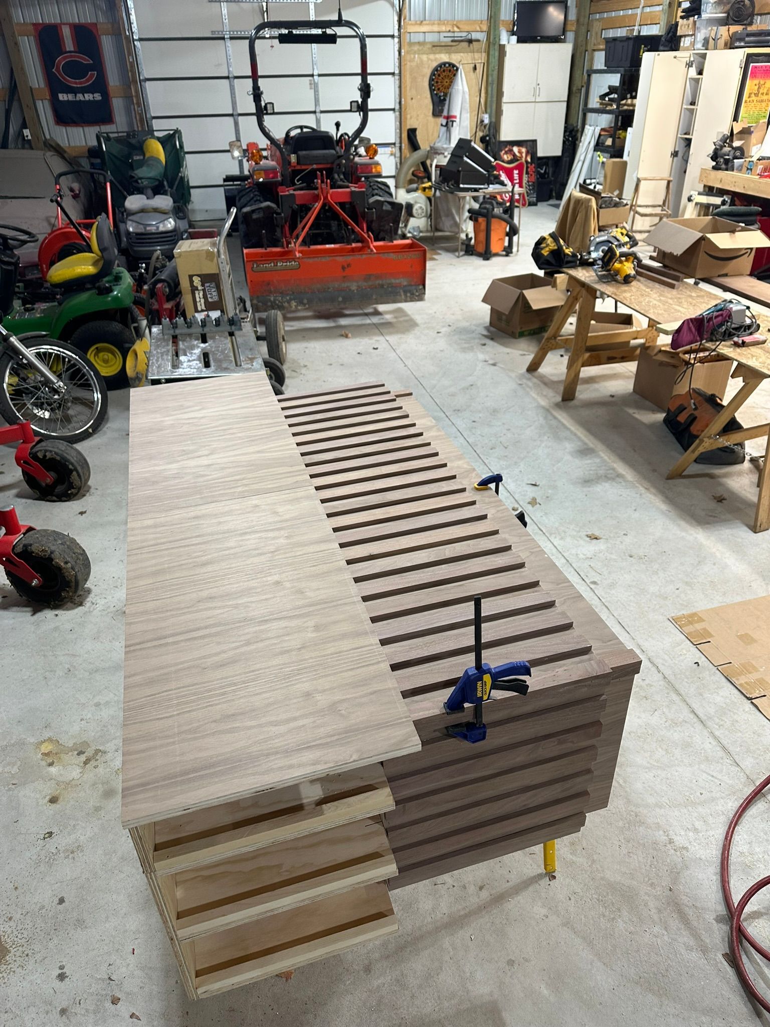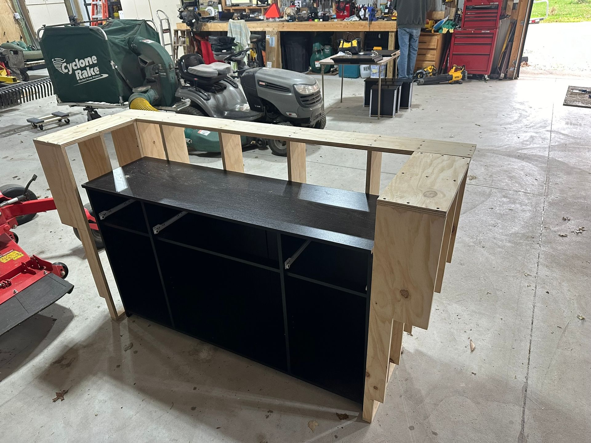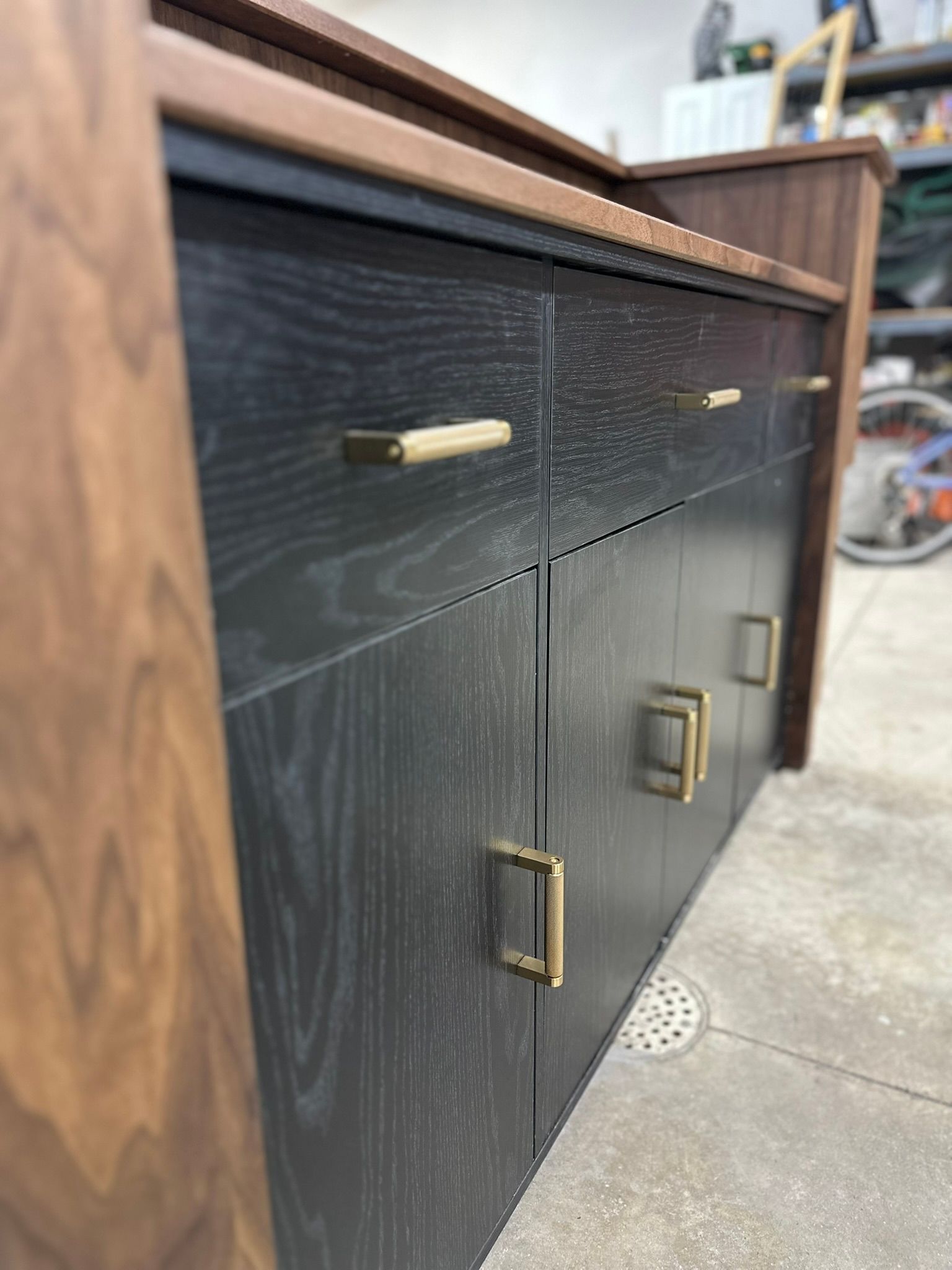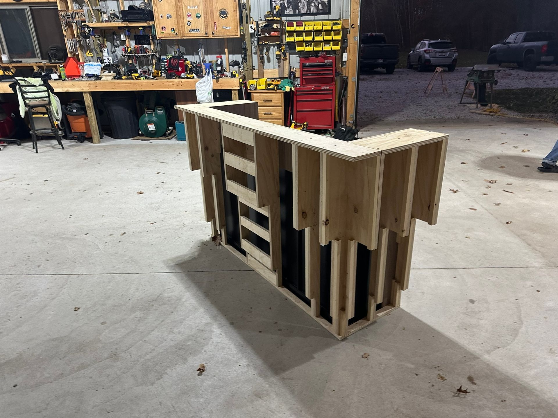 This is the first bar built under the Alessandrini Design label. It features a walnut tambour over walnut panels with our signature stacked array and lighting. The inside cabinets are black textured melamine to serve as a nondescript yet functional back bar. The counters are fabricated of solid walnut planks with a chamfered edge.