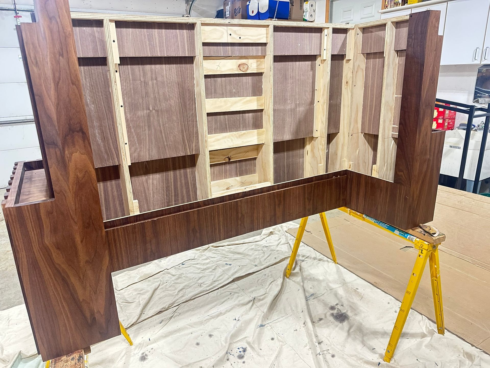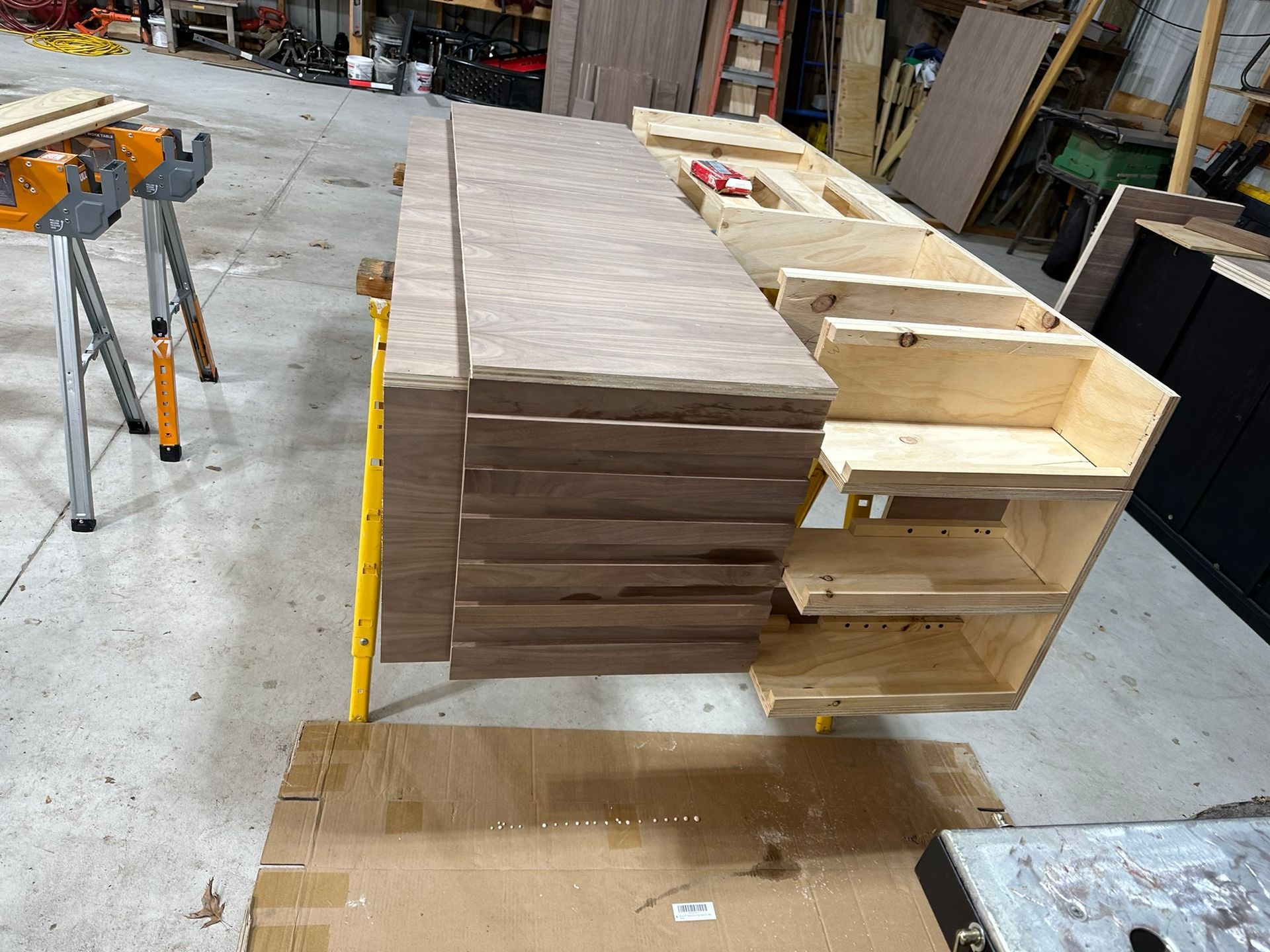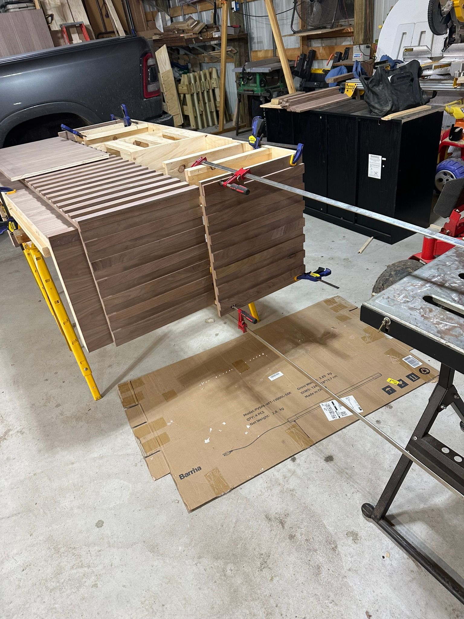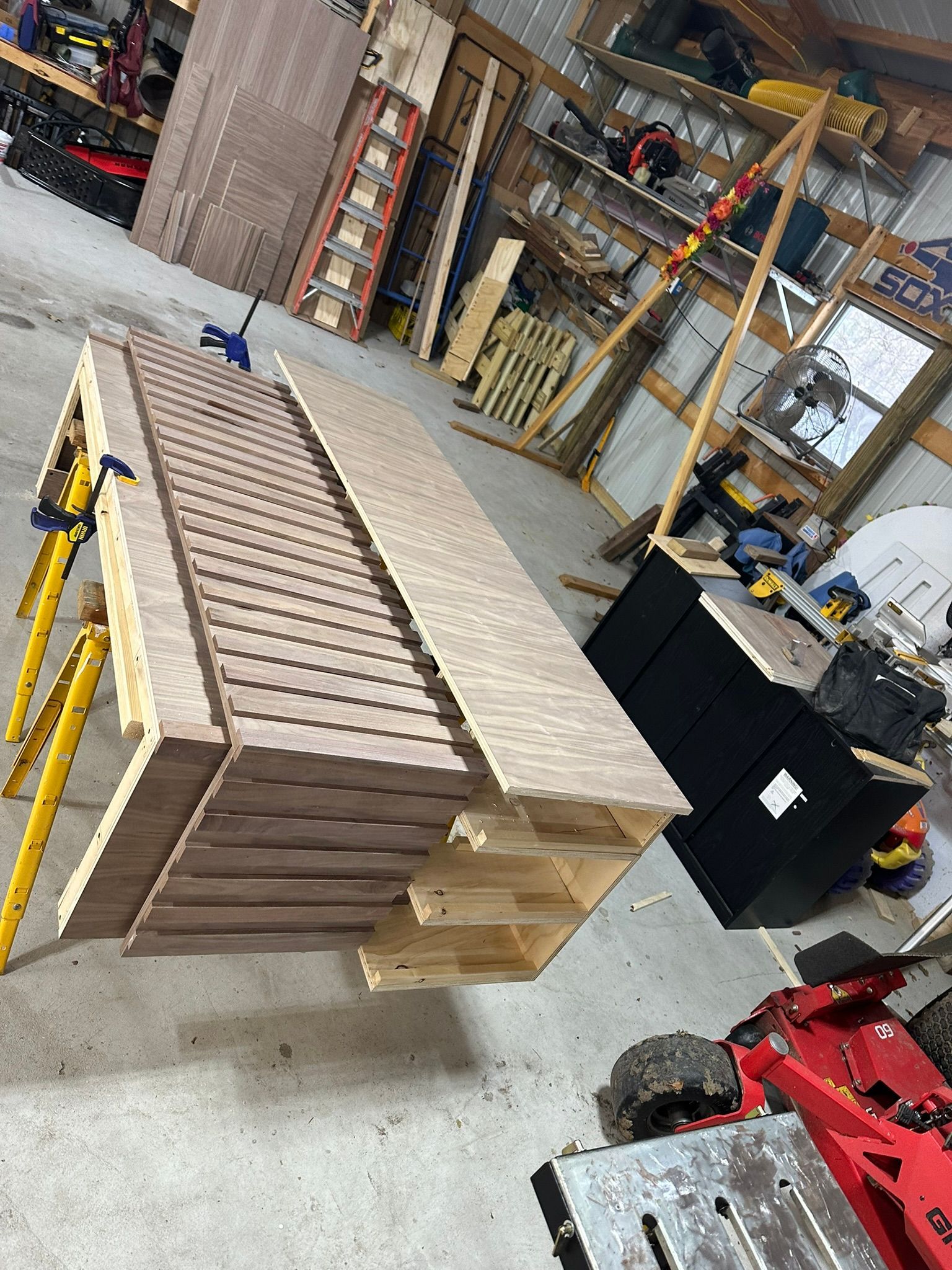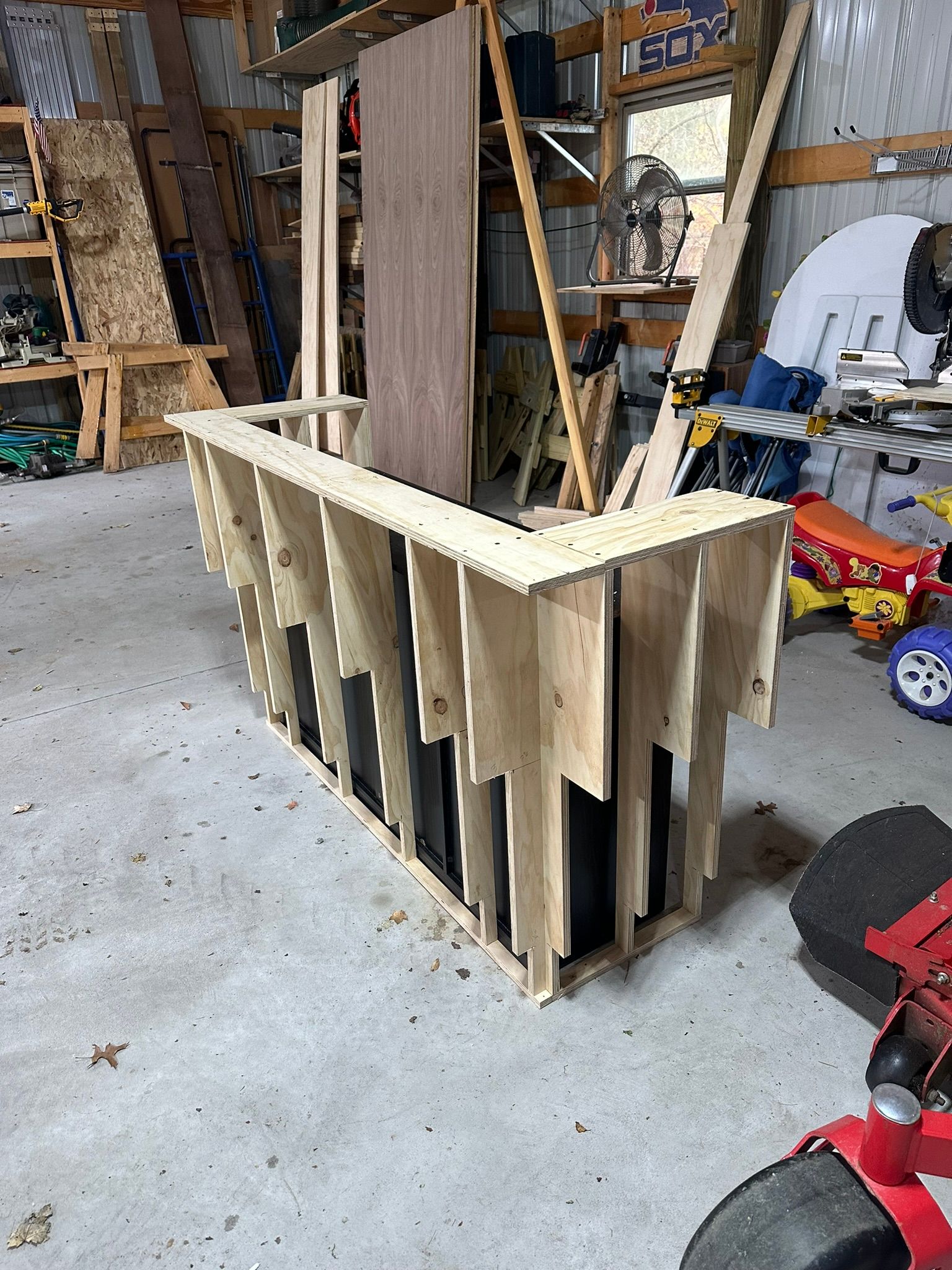 This is the first bar built under the Alessandrini Design label. It features a walnut tambour over walnut panels with our signature stacked array and lighting. The inside cabinets are black textured melamine to serve as a nondescript yet functional back bar. The counters are fabricated of solid walnut planks with a chamfered edge.